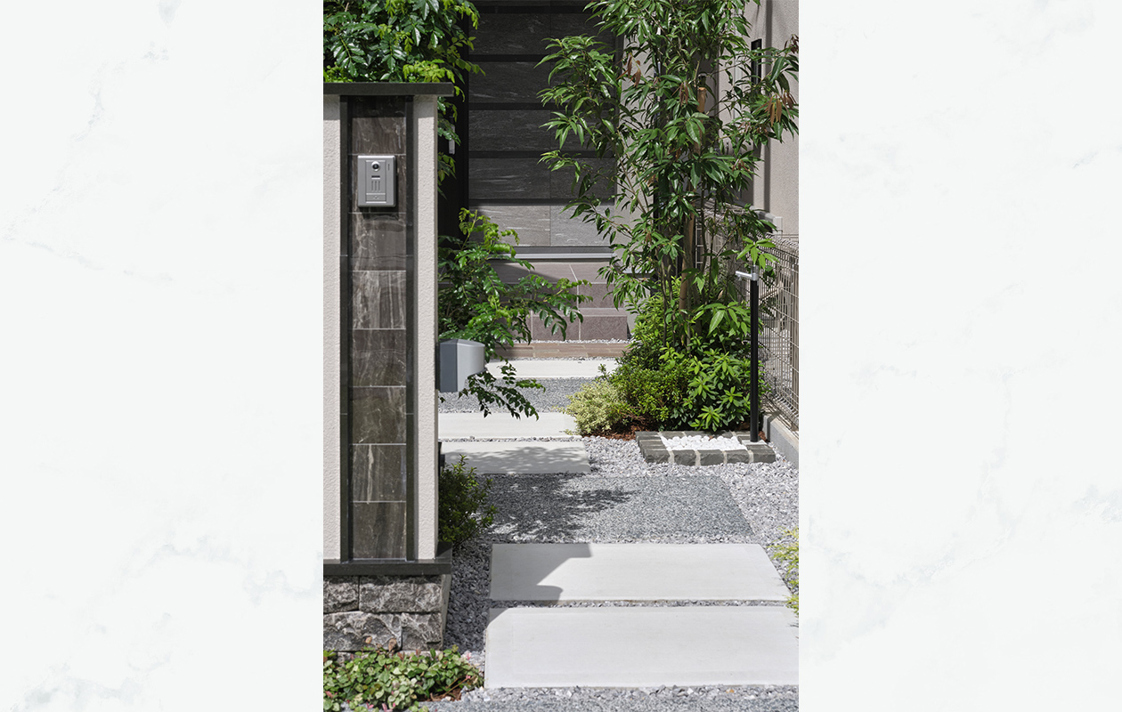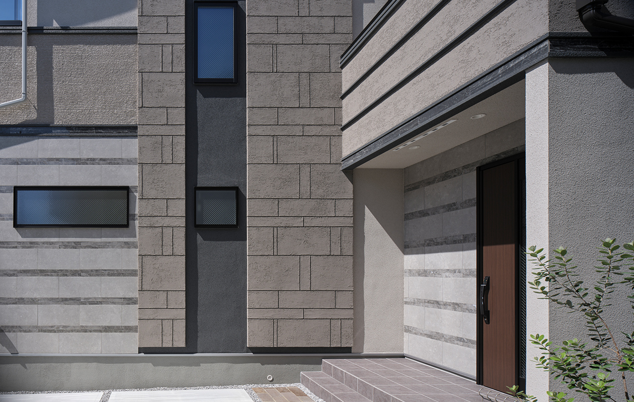 - 玄関周りの壁を大判タイルで仕上げました。堂々とした印象で壁面の広がりを際立たせ、建物の表情に風格を添えます。