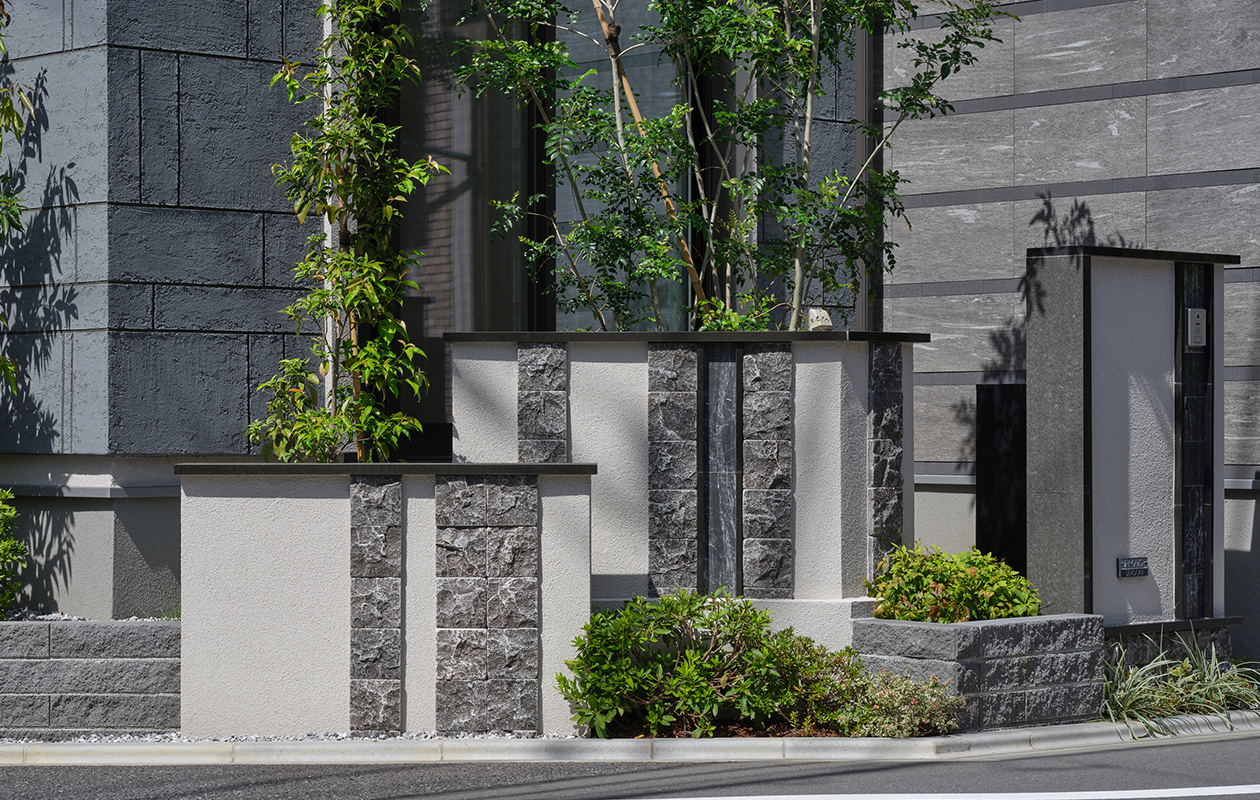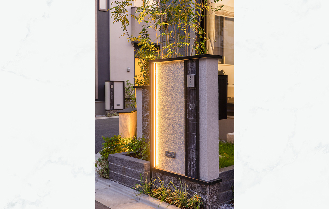 - 建物デザインと合わせて門柱も、石灰岩、玄武岩を貼り、アクセントに鏡面黒タイルを組み合わせて造作しました。(全邸に採用)