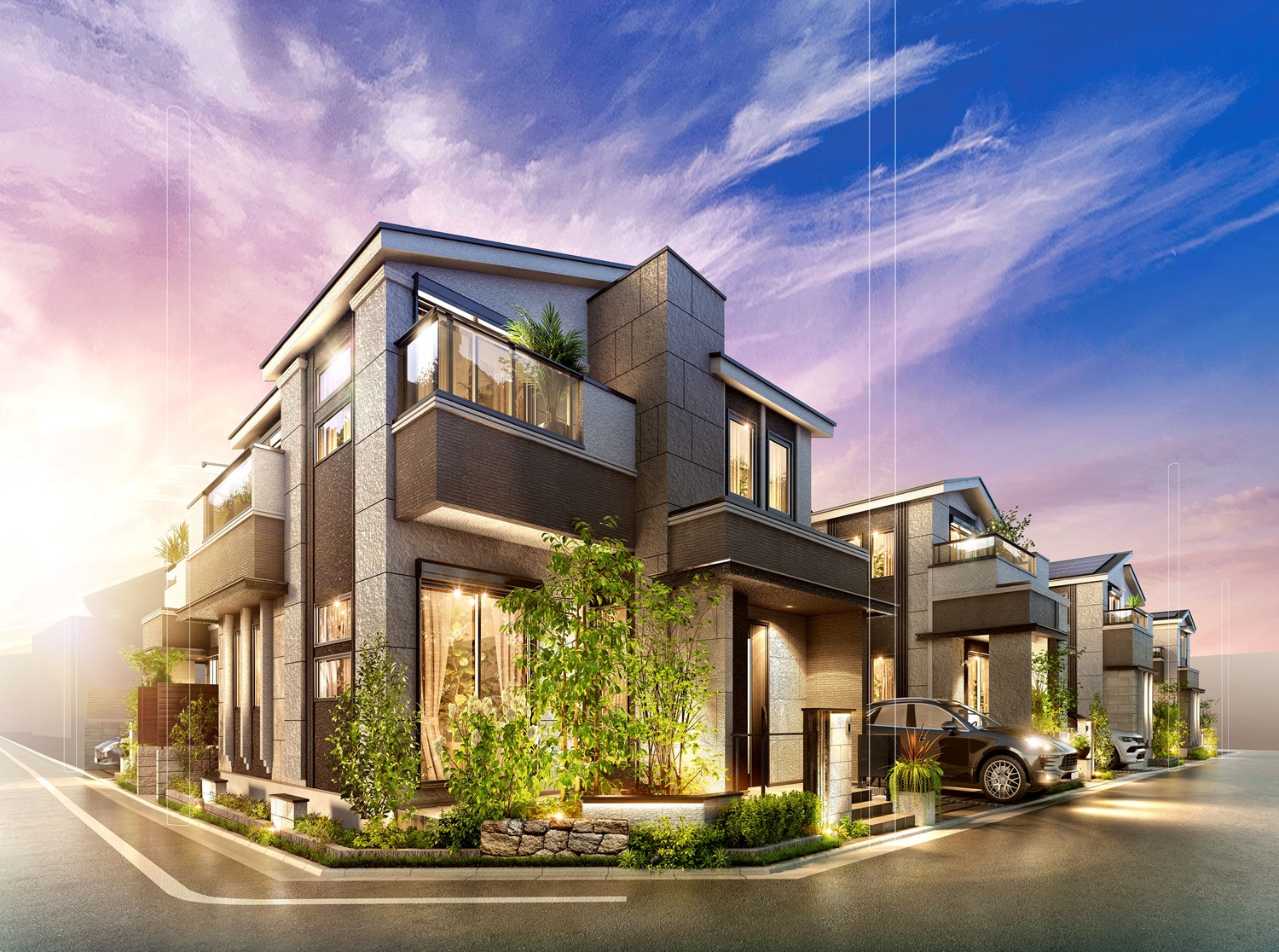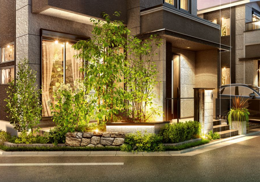 建物と外構が響き合う統一感ある意匠が、街並みに美しい一体感を与えます。