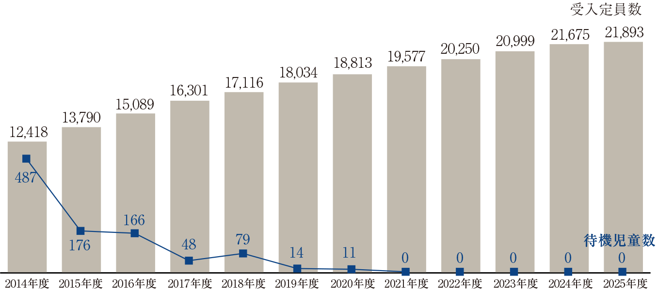 練馬区では、区独自の幼保一元化施設「練馬こども園」の創設をはじめ、1歳児の保育需要に対するセーフティネットとなる「1歳児1年保育事業」などを実施。2014年から2025年までの11年間で、全国トップクラスとなる約9,400人の定員増を実現し、待機児童数ゼロを達成しています。