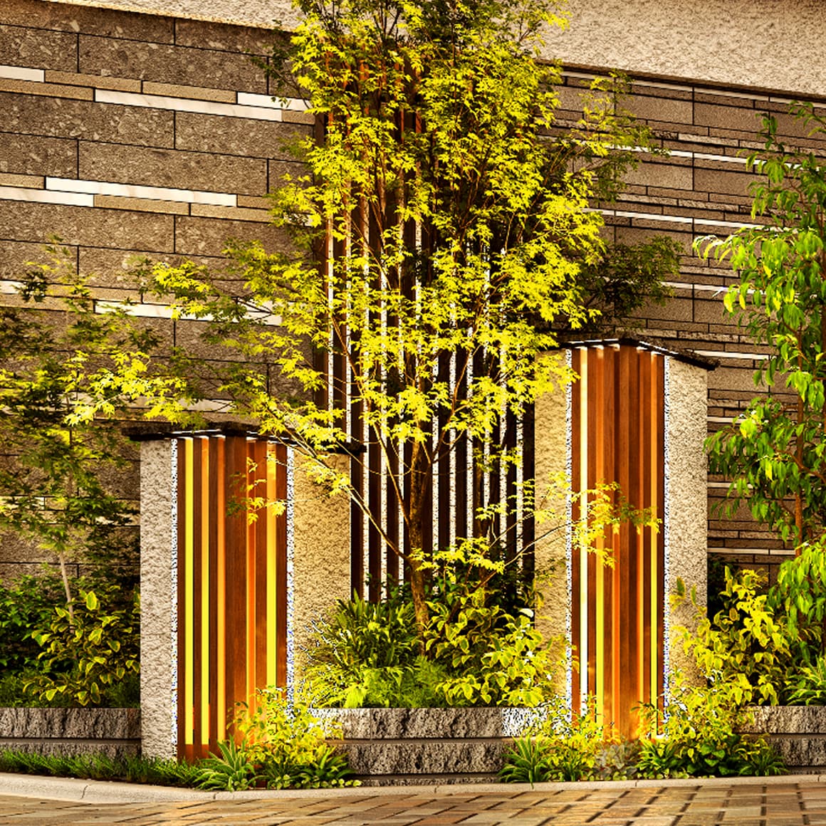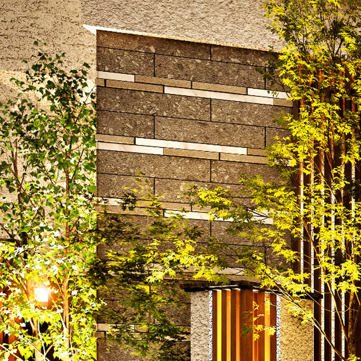 外壁とアクセントウォールに施された印象的な木調ルーバーが街並みに温かさと安らぎをもたらし、周囲の景観との調和を図ります。