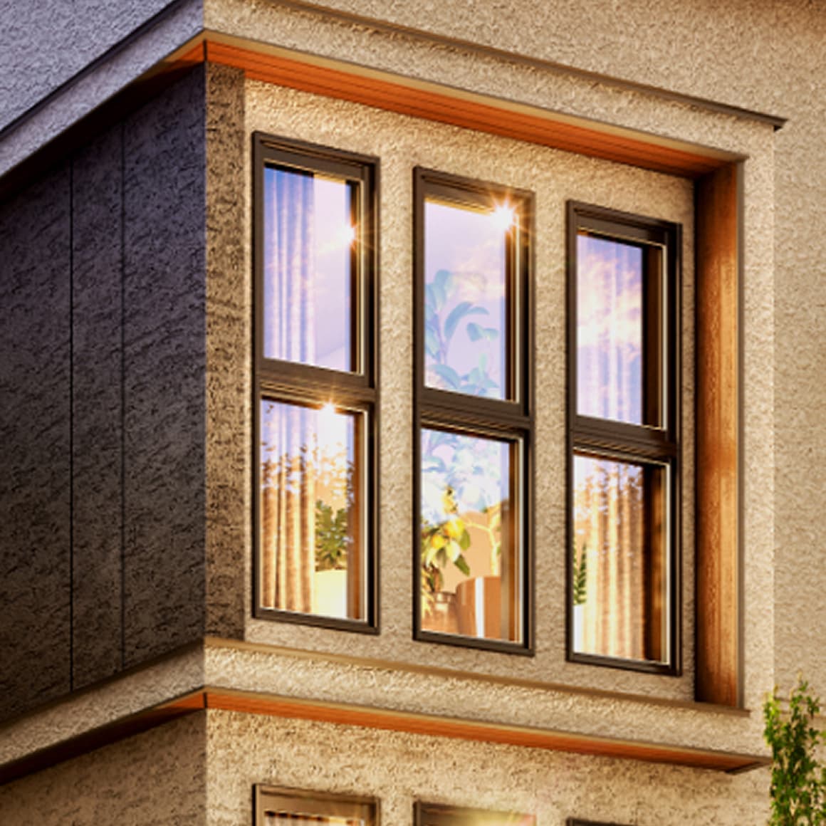 大型サッシを連続して用いた窓デザインは、外観への印象的なアクセントとなるとともに、大開口による採光の確保を実現します。