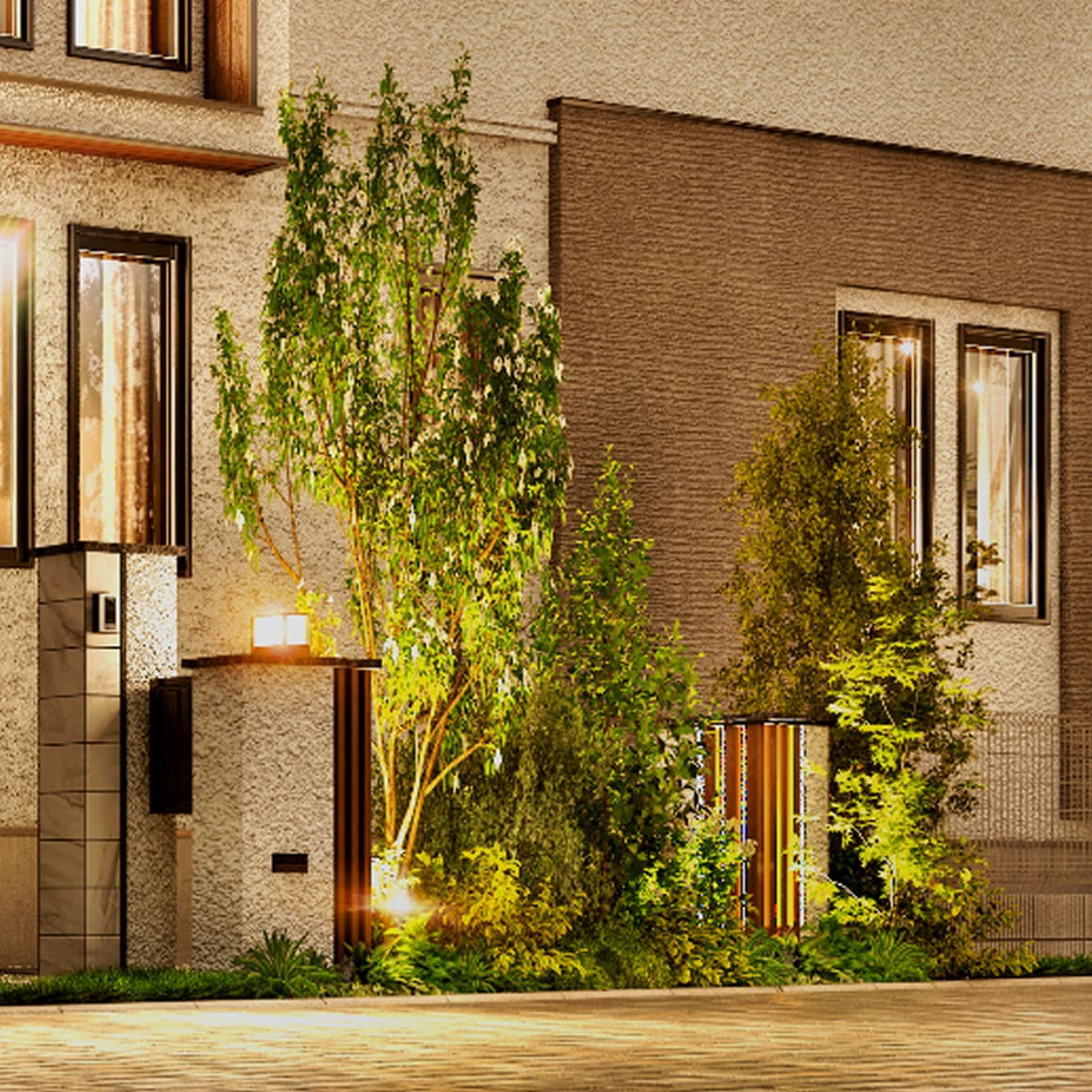 敷地内には木調素材をアクセントにした門柱を設置。季節を感じるコハウチカエデや常緑のヤマボウシなどの植栽と組み合わせることで、緑豊かな街区の表情を演出します。