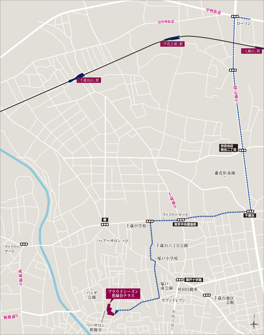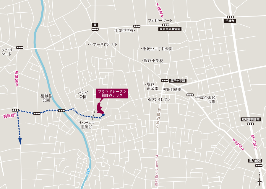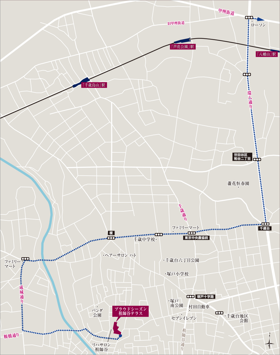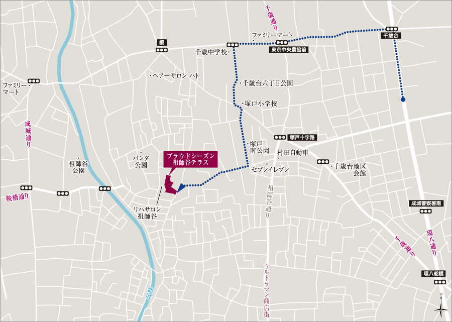 お帰りの際「プラウドシーズン祖師谷テラス」→「成城通り」