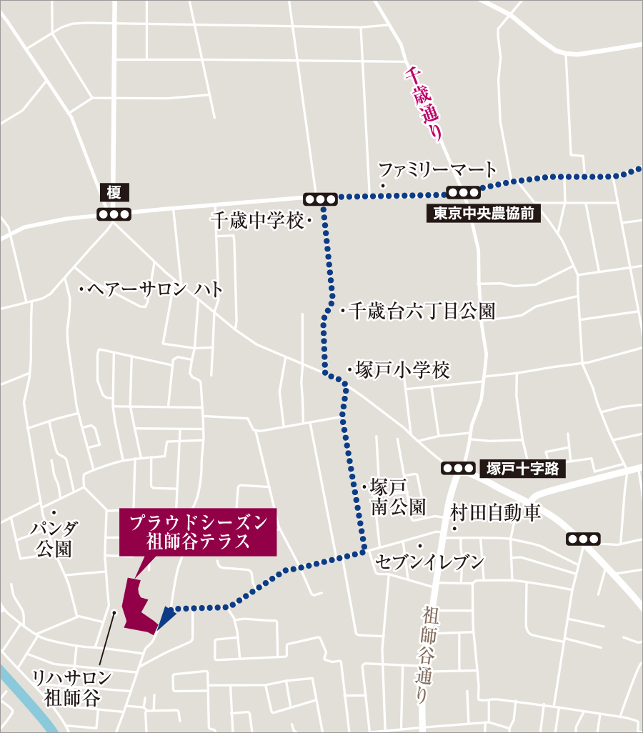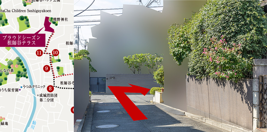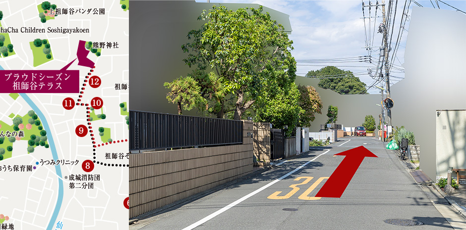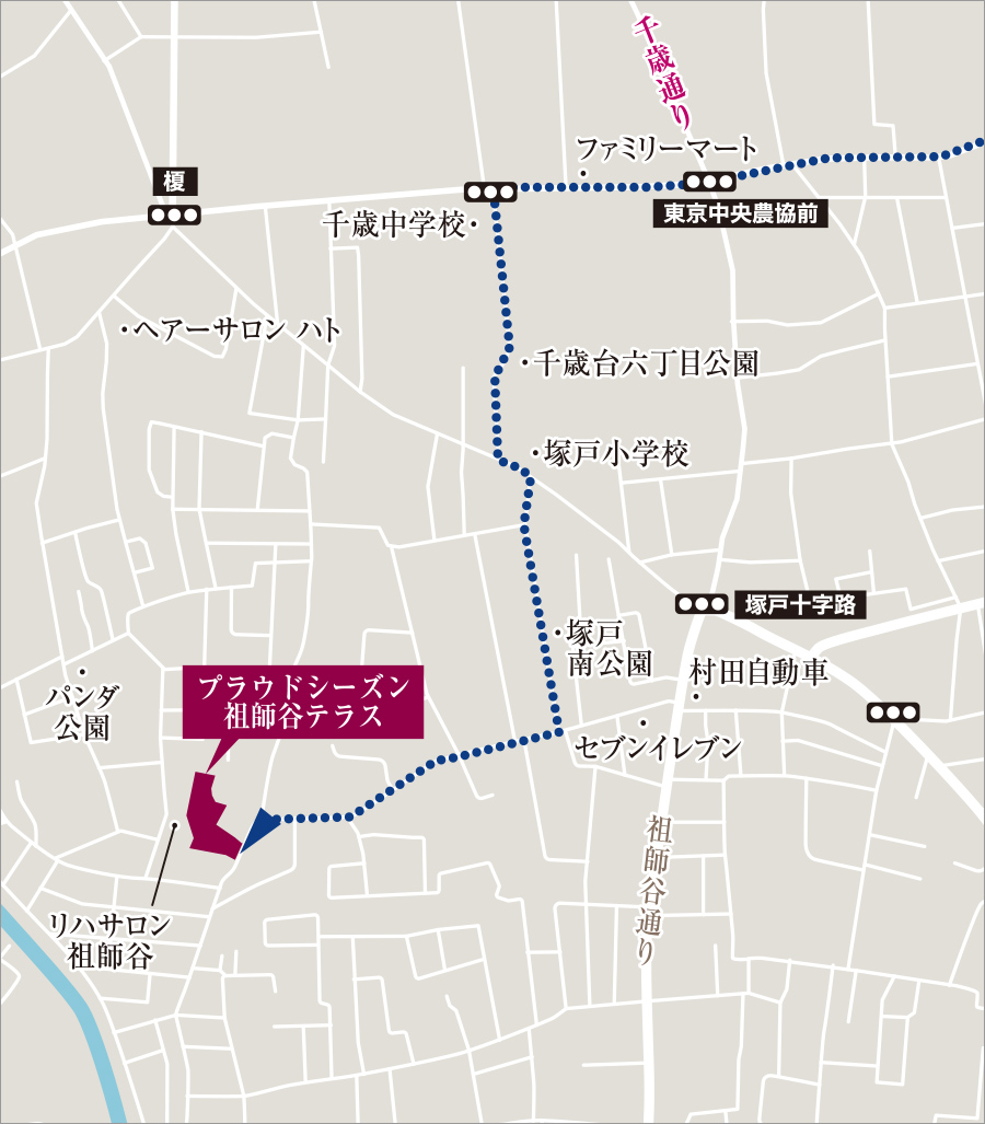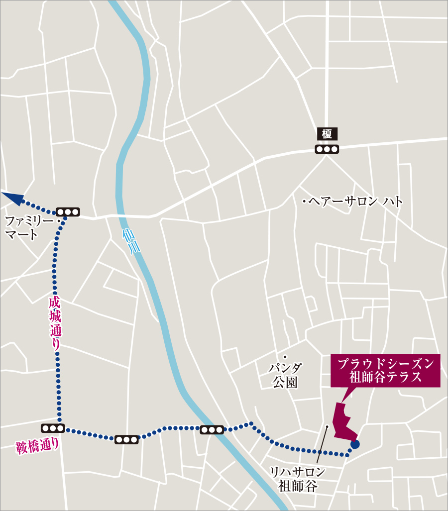 お帰りの際「プラウドシーズン祖師谷テラス」→「成城通り」