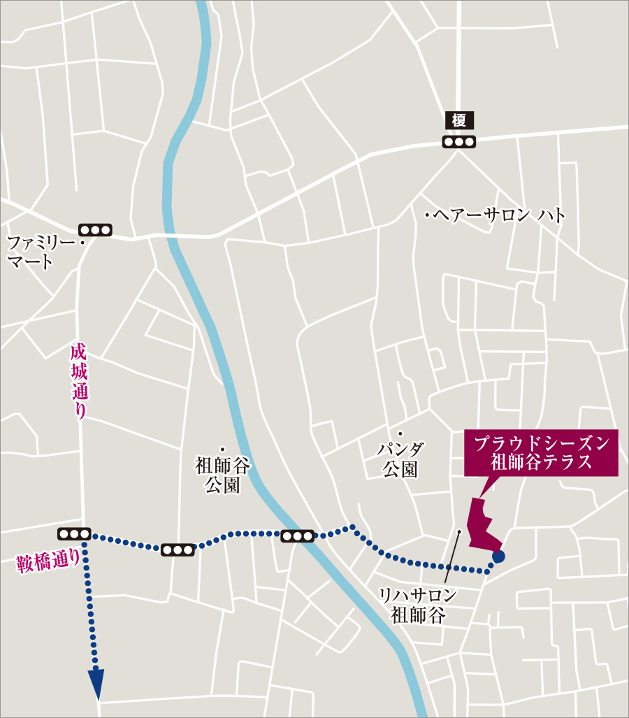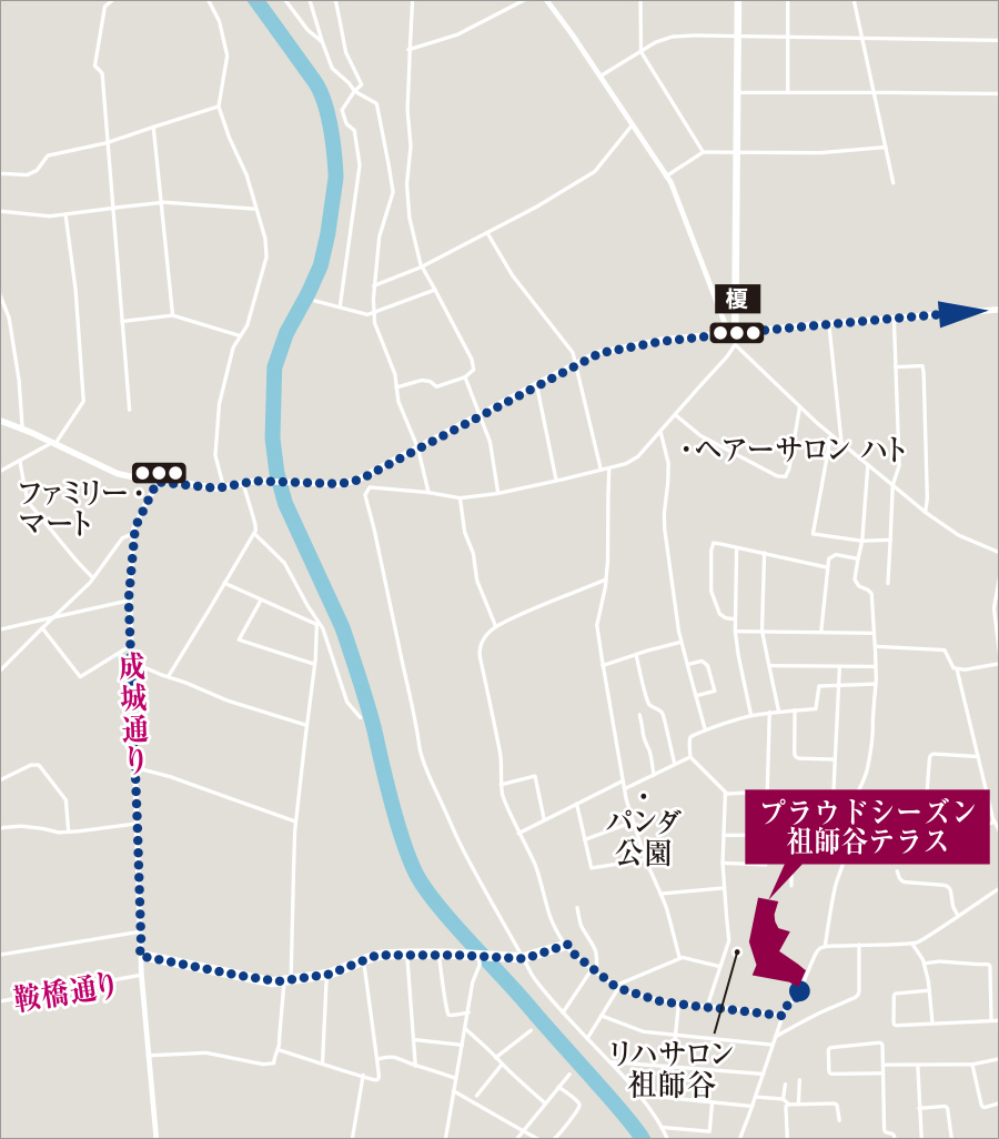 お越しの際「環八通り」→「プラウドシーズン祖師谷テラス」