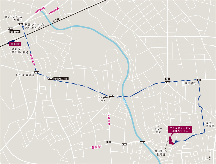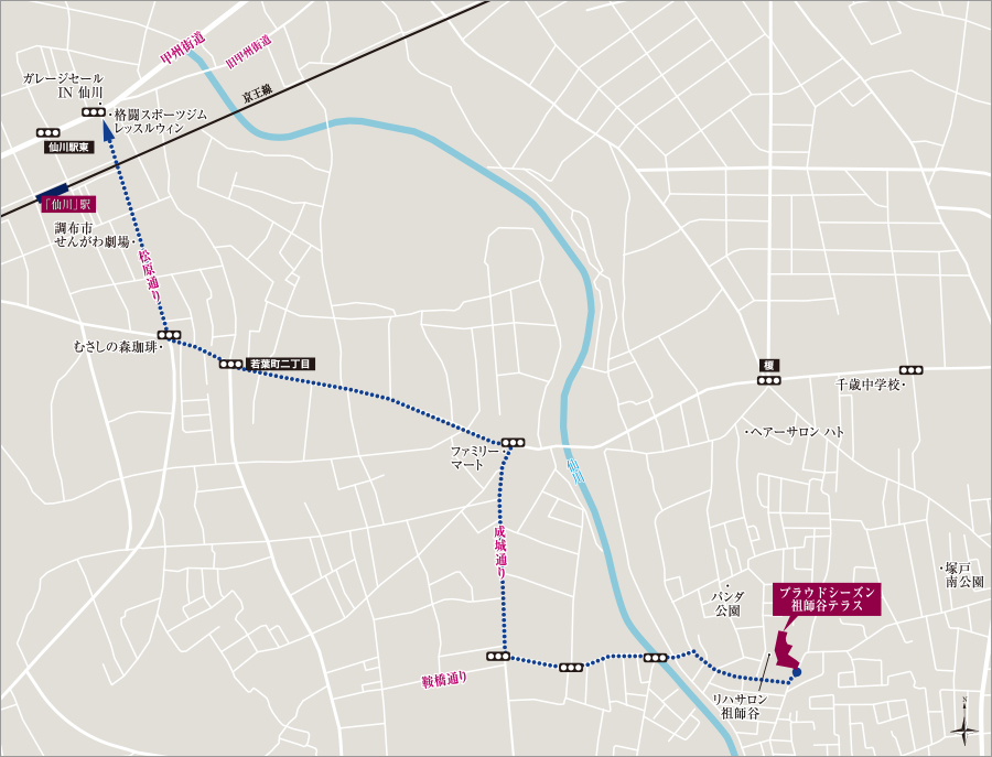 お越しの際「甲州街道(仙川方面)」→「プラウドシーズン祖師谷テラス」