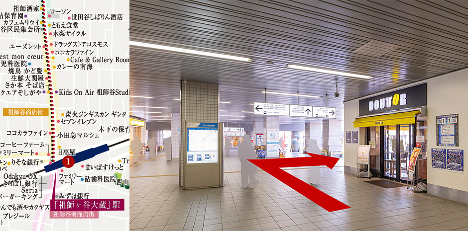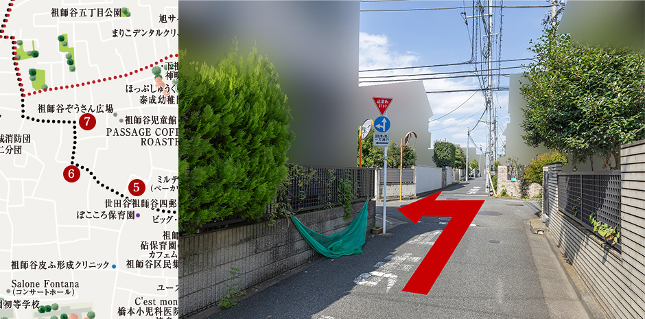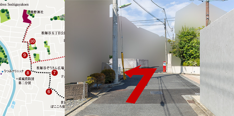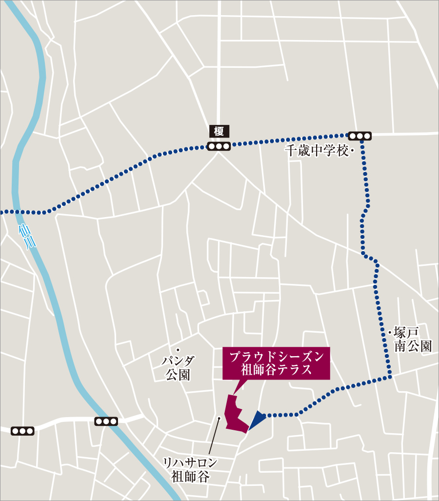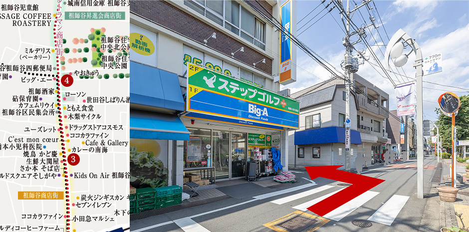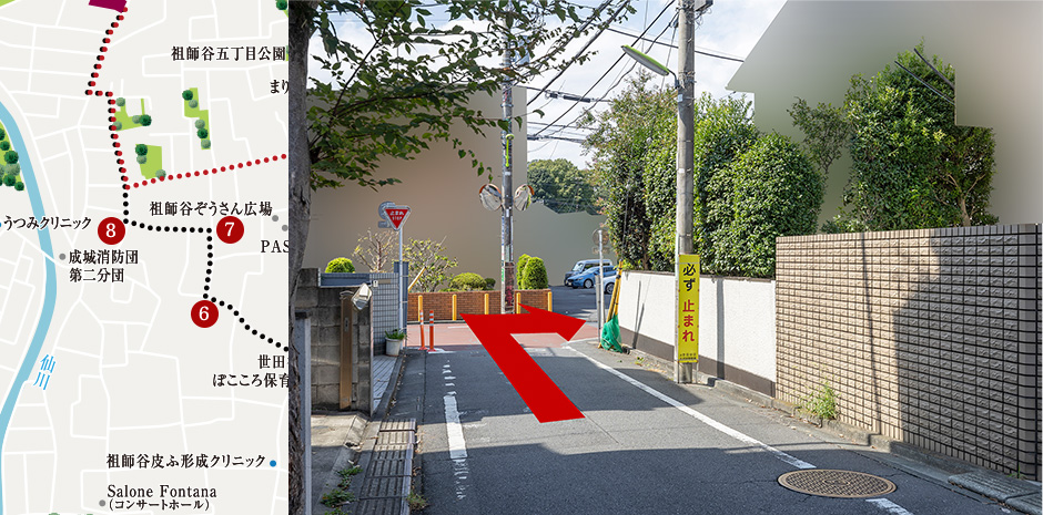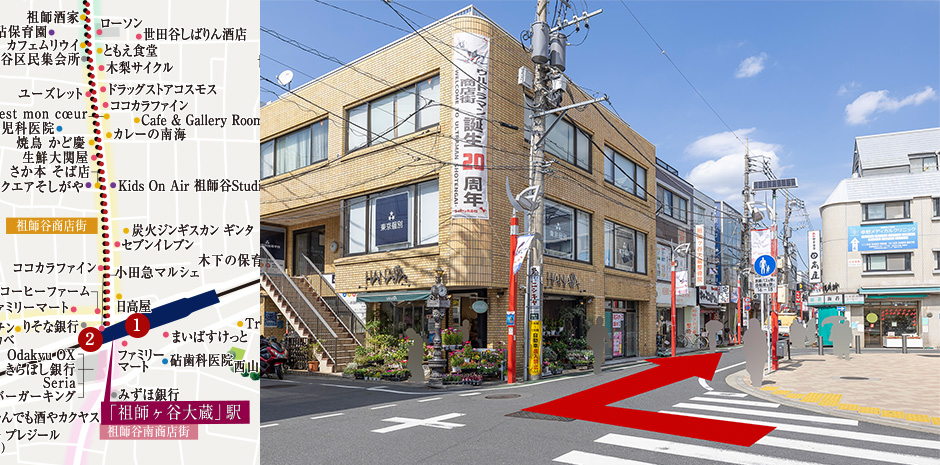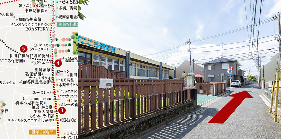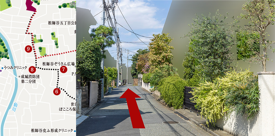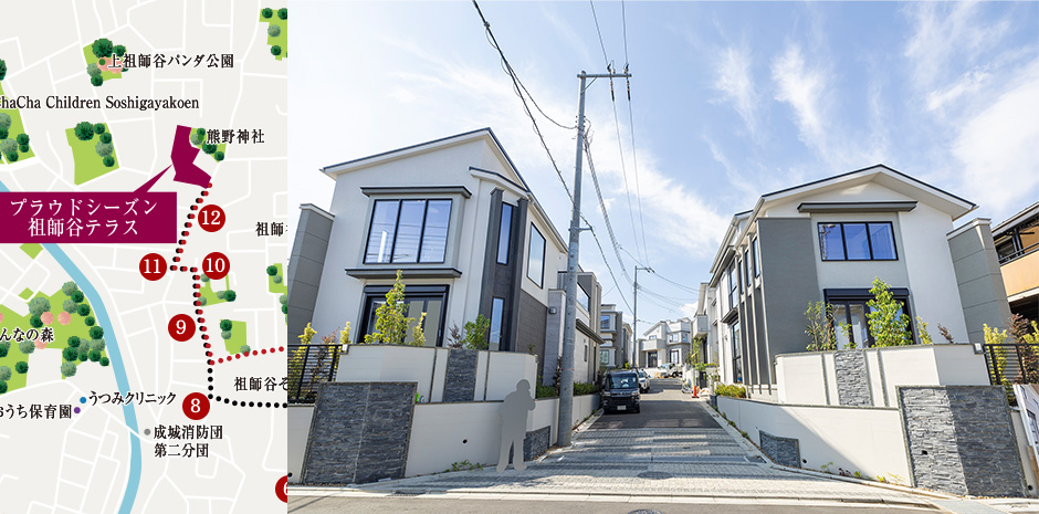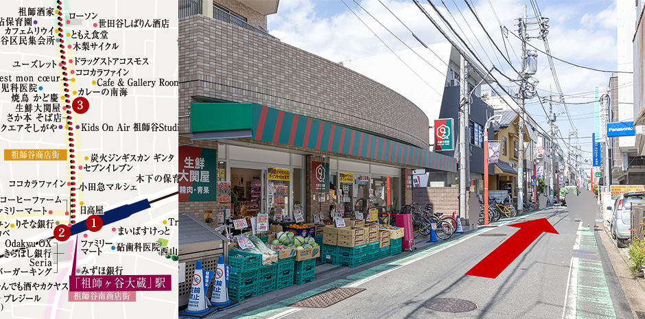 「祖師ヶ谷大蔵」駅から現地までの徒歩ルートを周辺環境とともにご確認いただけます。左右にスライドさせてご確認ください。