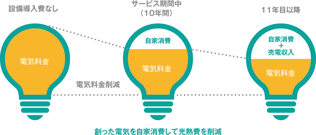 エネシャインを導入することで、太陽光発電設備を初期費用0円、月額利用料0円※1、 発電した電気も0円※2で利用することができます。