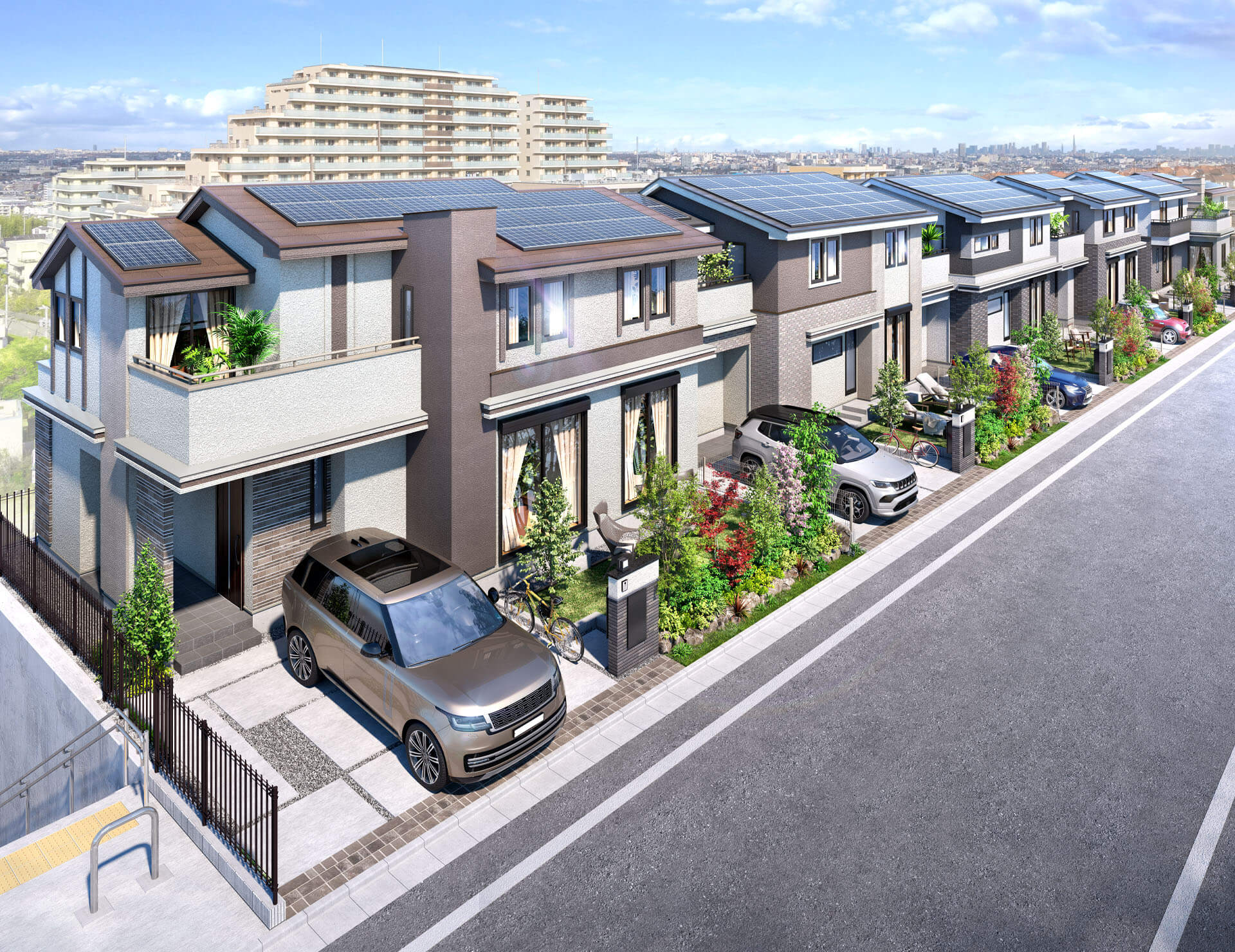 - ※掲載の街並み完成予想図は計画段階の図面を基に描いたものに現地写真(2025年12月撮影)を合成しCG加工を施したもので実際とは異なります。また、今後変更になる場合があります。なお、外観の細部・設備機器・配管類等は一部省略又は簡略化しております。タイルや各種部材につきましては、実物と質感・色等の見え方が異なる場合があります。植栽につきましては特定の季節の状況を表現したものではなく、竣工時には完成予想図程度には成長しておりません。なお、眺望は各住戸により異なり、今後周辺環境の変化に伴い将来にわたって保証されるものではありません。