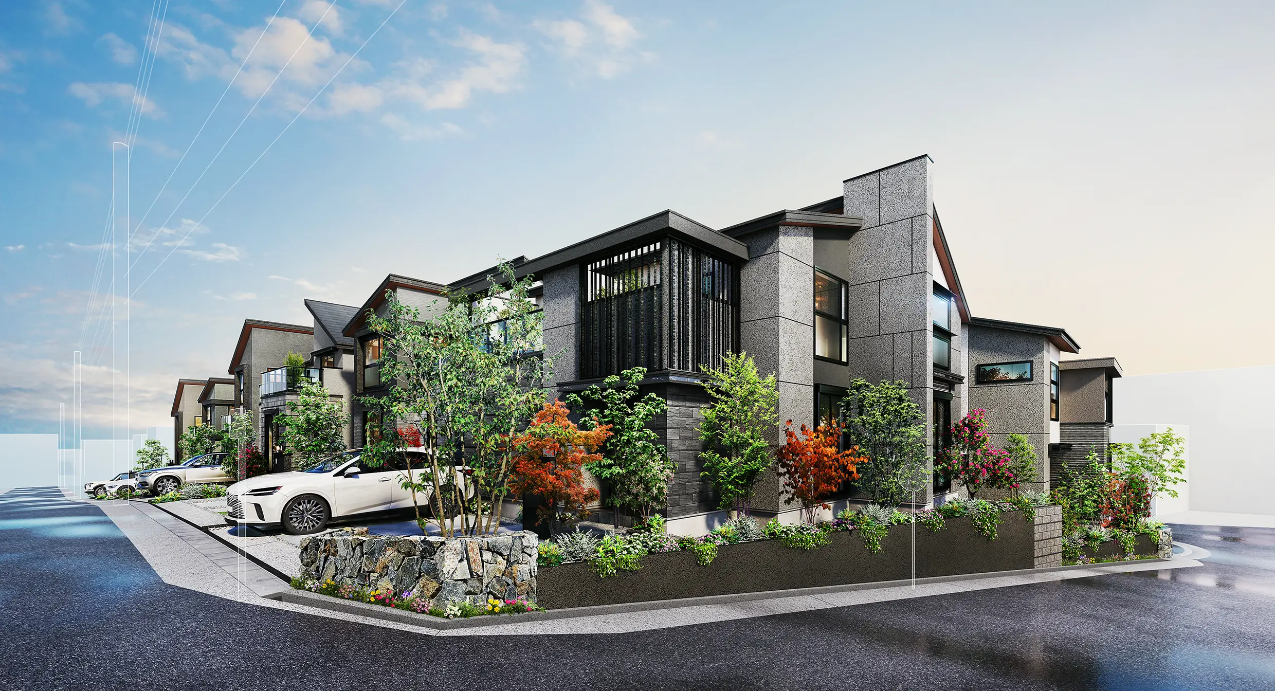 大型サッシや重厚感ある外観設計、街並み照明計画により洗練された邸宅街を実現。