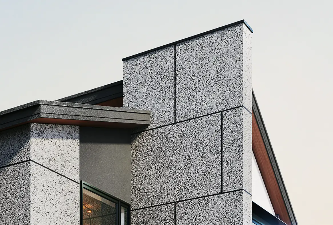 外壁に採用した砂状吹付は、堂々とした印象で壁面の広がりを際立たせ、建物の表情に風格を添えます。