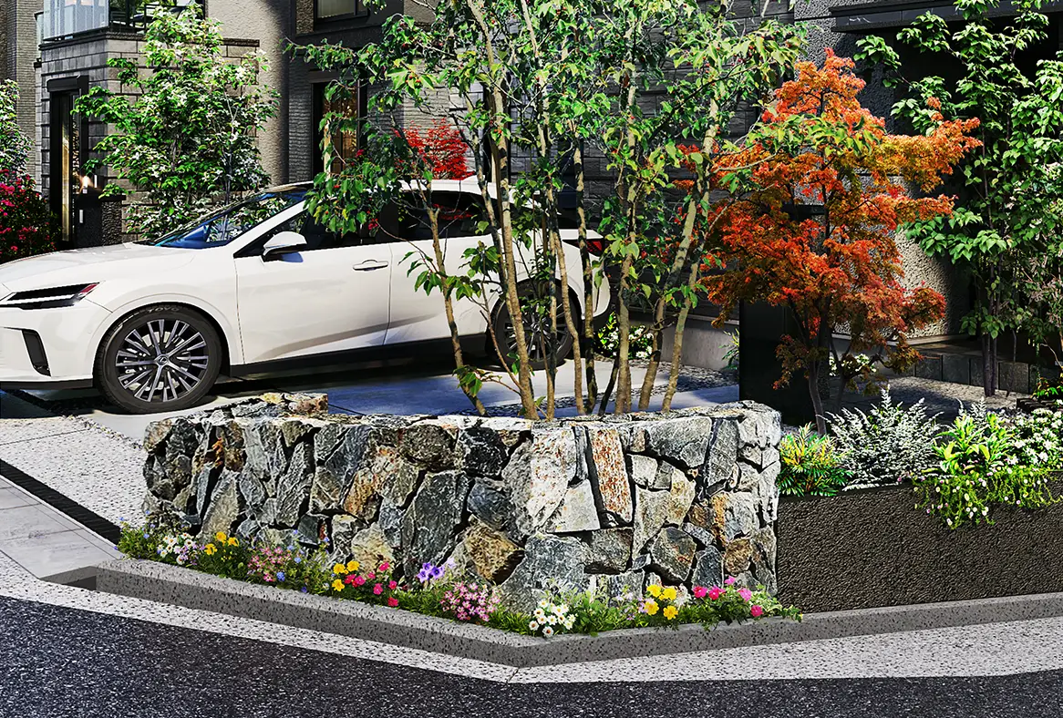 街区内の角には、コーナーウォールを配し、街路のアクセントを創っています。美しい花々や樹々とともに創られたコーナーウォールは、華やかな街の風景の一部になります。(ST1,7に採用)
