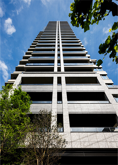 渋谷の中でも落ち着いたエリアにあることから、外観は邸宅らしい構えを演出したいと考え、低層部は石を多用して重厚さを出しています。南東のコーナー部には十分な空地を確保し、地域の人々も安心して歩ける空間を設けました。