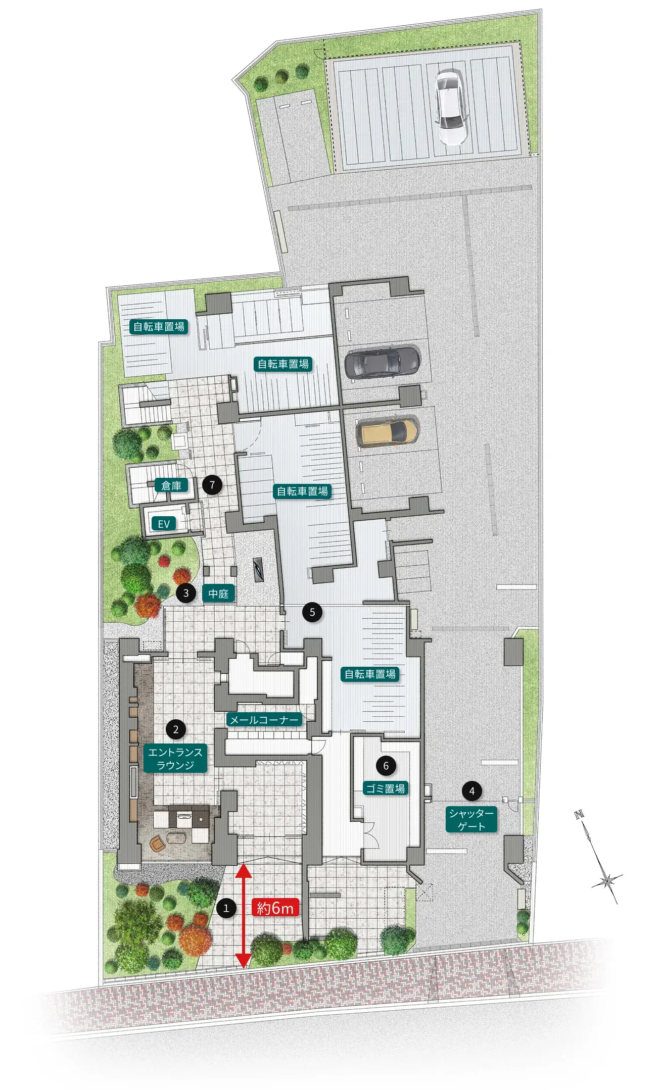 敷地計画では道路から約6mのセットバックを確保した上で、四季の植栽をレイアウトし、独立性を高めています。駐車場や駐輪場も敷地のセキュリティ内に設けました。