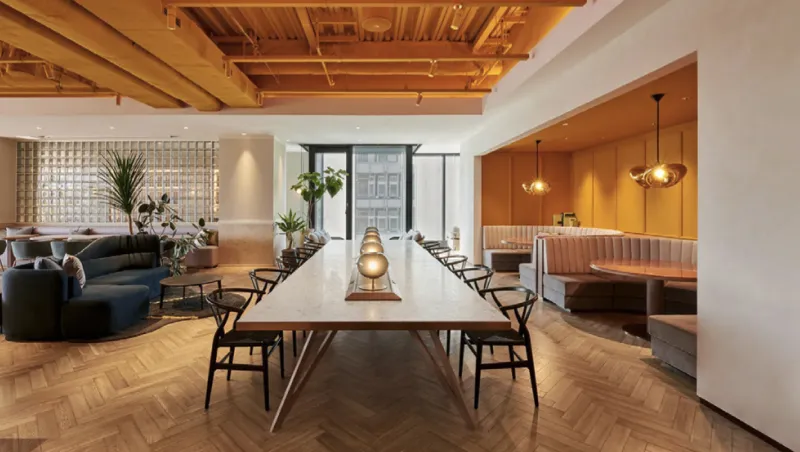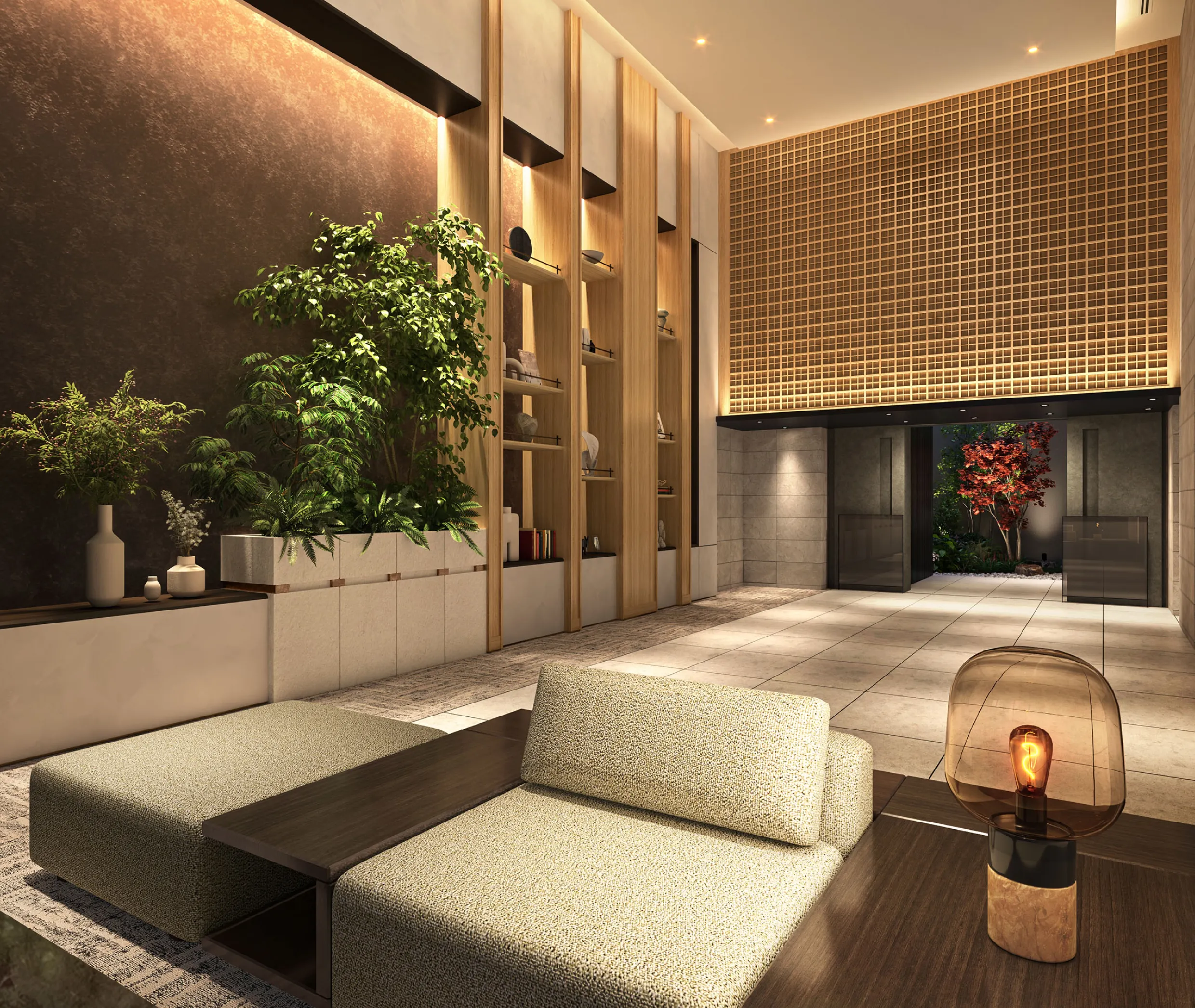 2層吹き抜けの雄大なエントランスラウンジはデザインモチーフの「木組み」を、国産木を使用し都会的な空間デザインに落とし込み、落ち着いた色調のインテリアでコーディネイト。各所に緑を配することでアクセントも付けています。扉の奥には正面のイロハモミジを中心に、低木から中高木までバランス良くレイアウトされた中庭が広がります。