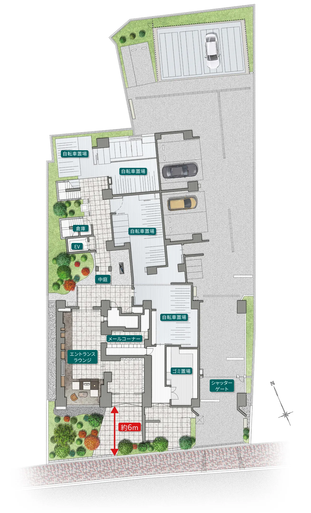 敷地計画では道路から約6mのセットバックを確保した上で、四季の植栽をレイアウトし、独立性を高めています。駐車場や駐輪場も敷地のセキュリティ内に設けました。