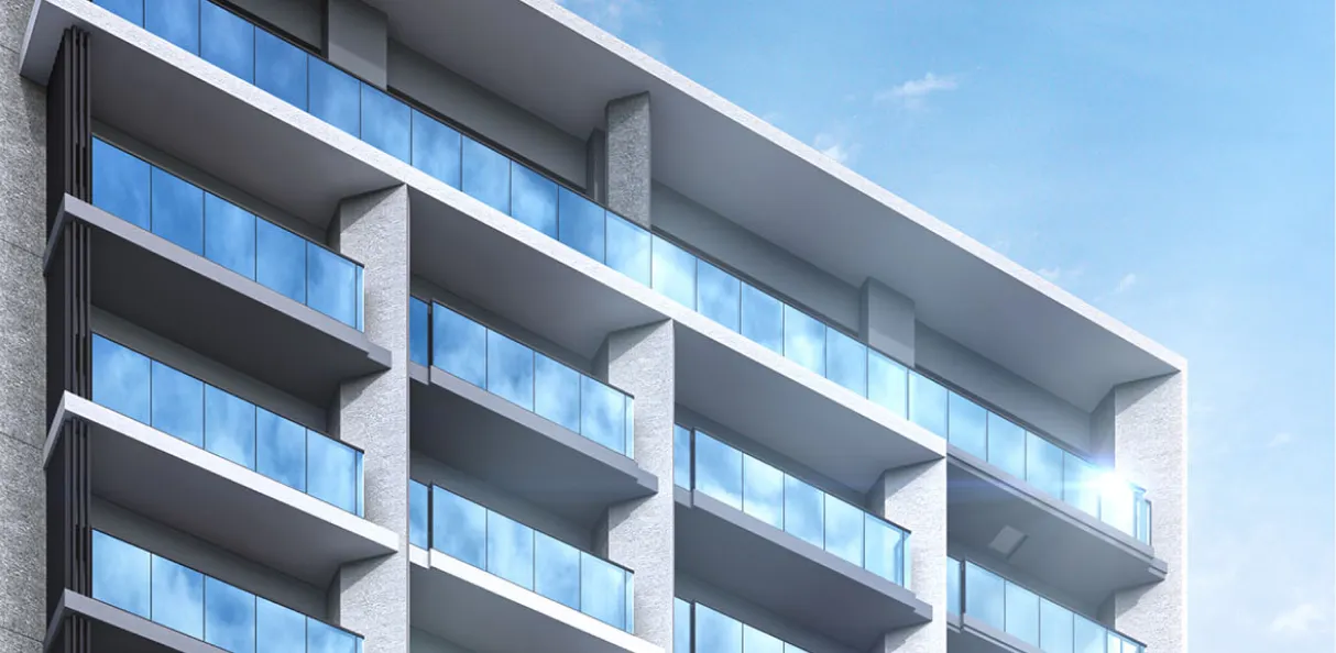 南棟住戸のバルコニー手摺は特殊金属膜コーティングガラスを使用し、意匠性を高めたラミスカイを採用しました。
