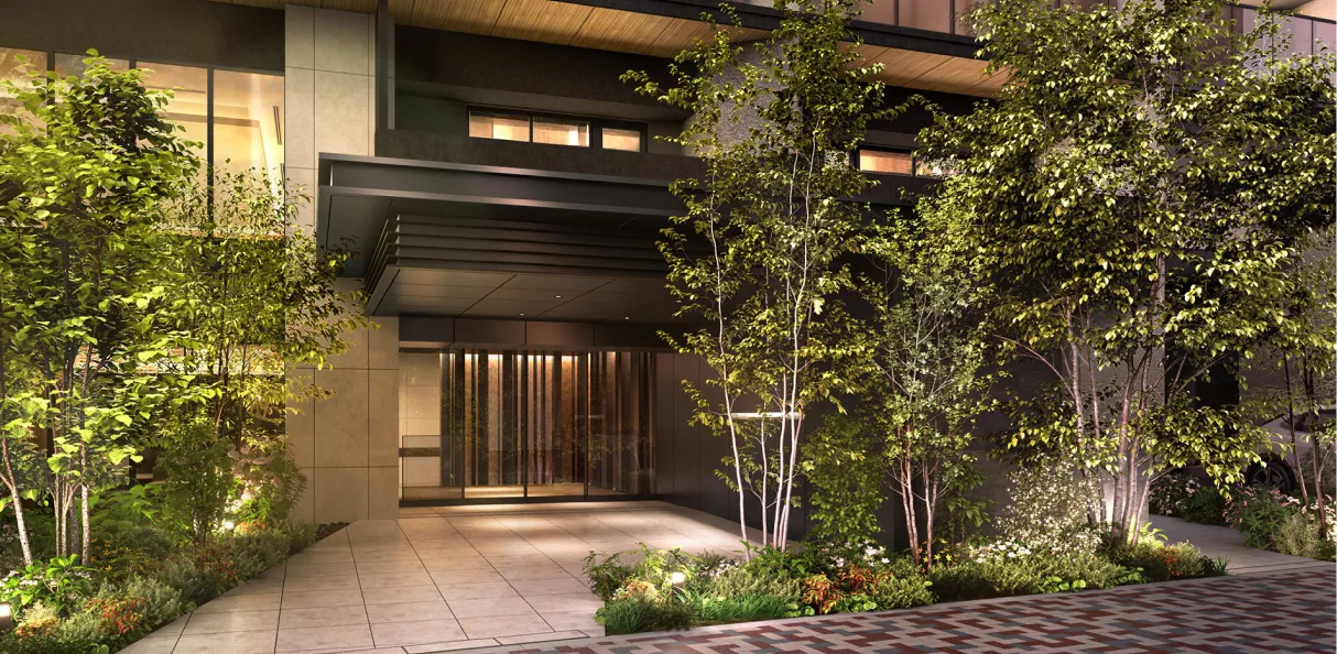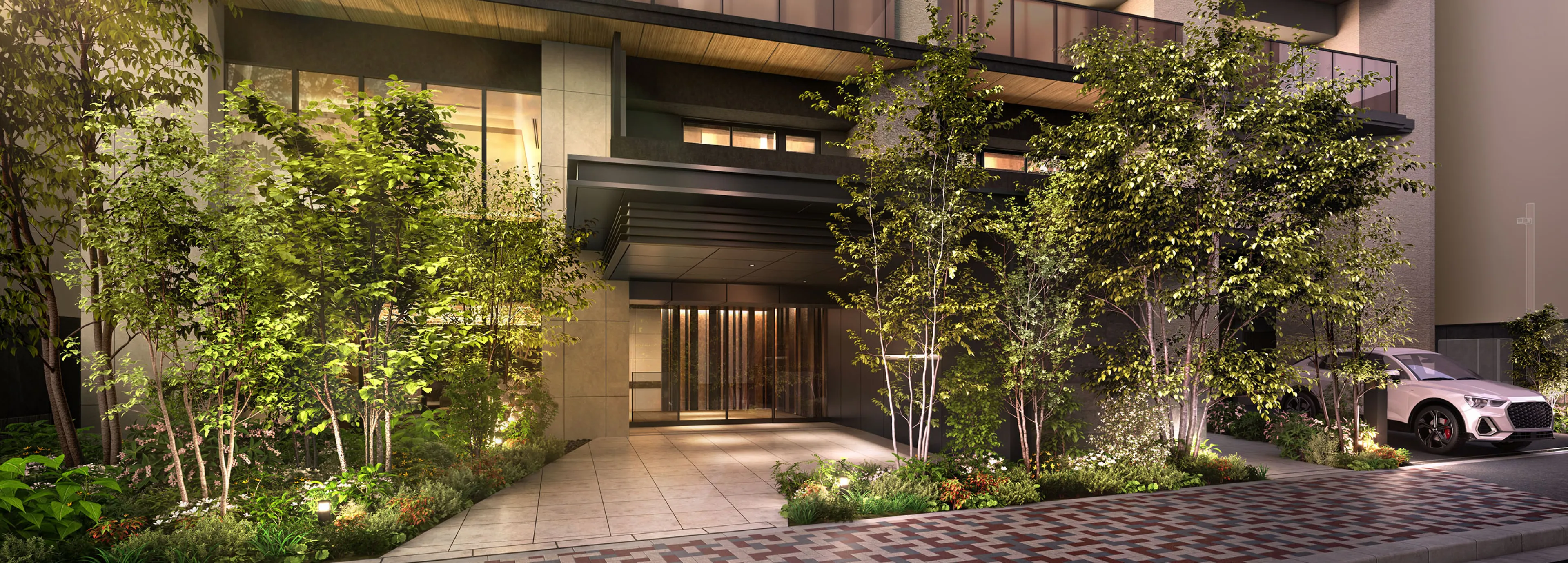2層吹き抜けの雄大なエントランスラウンジはデザインモチーフの「木組み」を、国産木を使用し都会的な空間デザインに落とし込み、落ち着いた色調のインテリアでコーディネイト。各所に緑を配することでアクセントも付けています。扉の奥には正面のイロハモミジを中心に、低木から中高木までバランス良くレイアウトされた中庭が広がります。