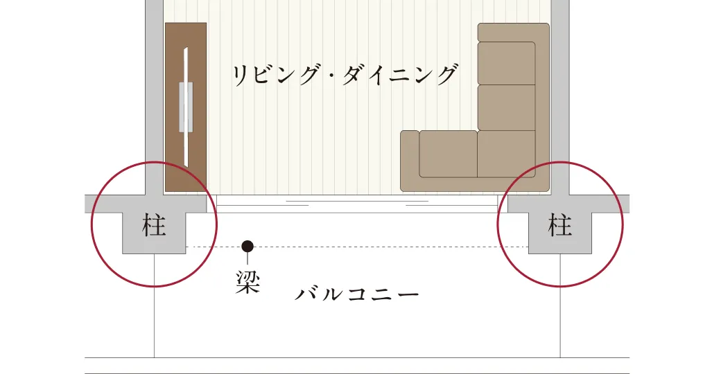 室内への柱の張り出しをなくし、より使いやすい空間ができるアウトポール設計を、バルコニー側と廊下側の両面で採用