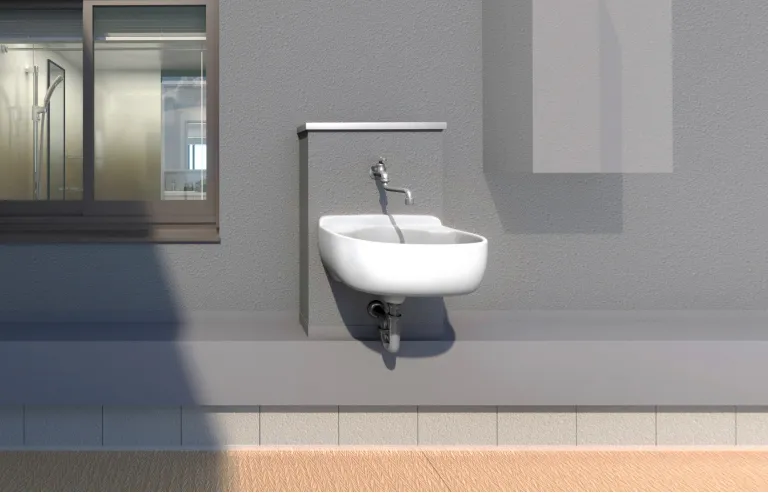ルーフバルコニーに、洗いものやガーデニングの水やりに便利なスロップシンクを設置しています。