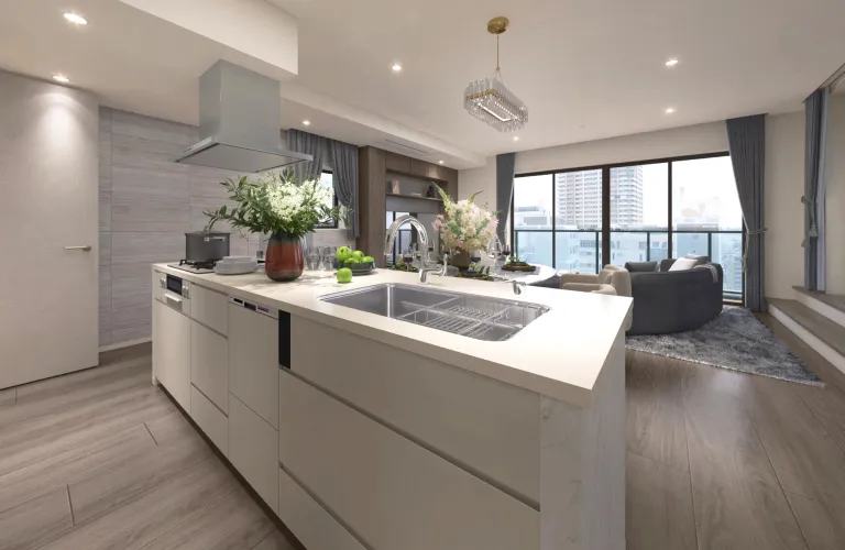 リビング・ダイニングとつながり開放的。キッチン部分を壁面から独立させた、アイランドキッチンを採用しています。