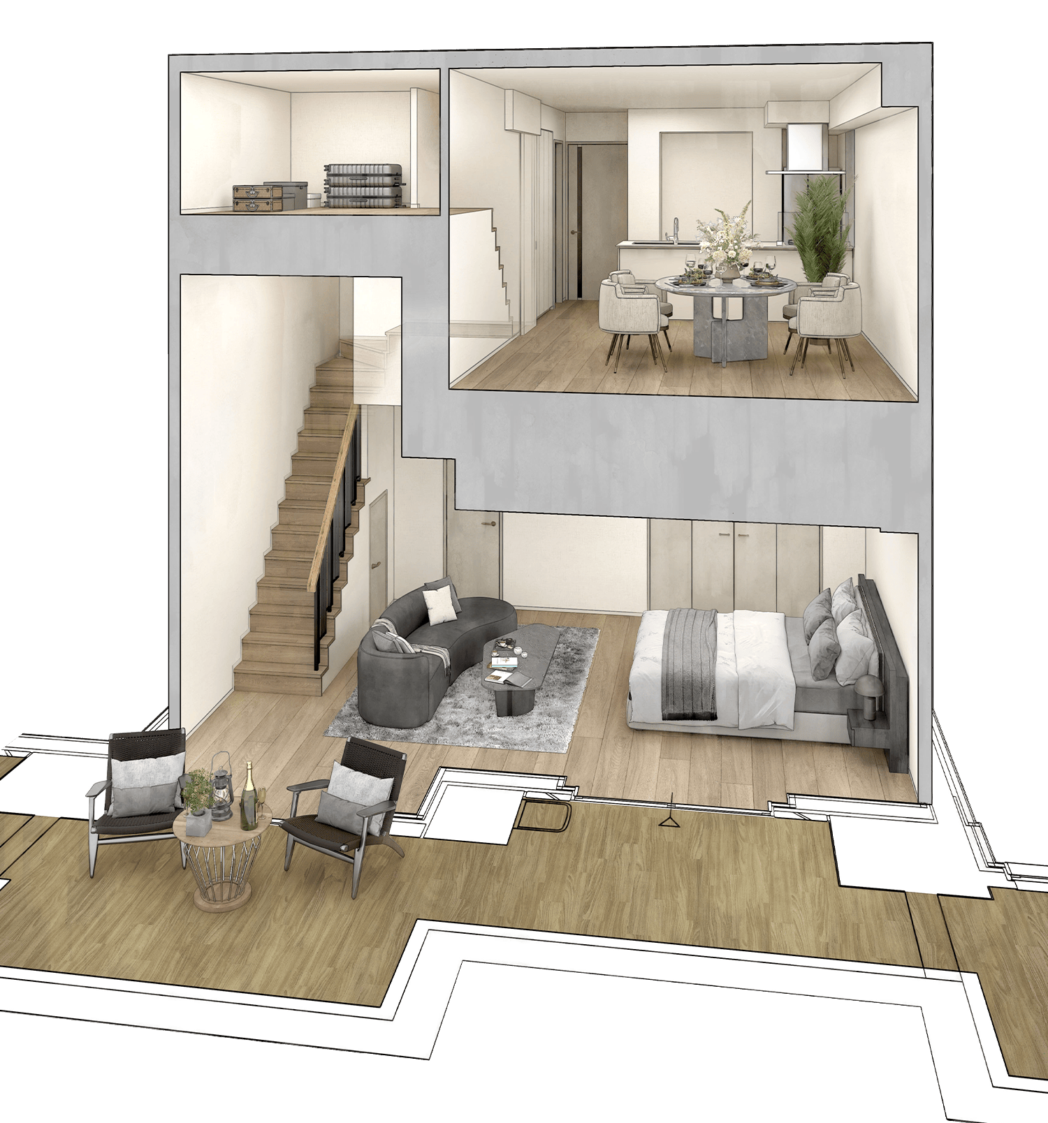 ※掲載のメゾネット住戸概念イラスト(Rタイプ)は、計画段階の図面を基に描き起こしたもので実際の見え方と異なります。形状の細部・設備機器などは再現しておりません。また家具・照明・調度品・備品等は販売価格に含まれておりません。
