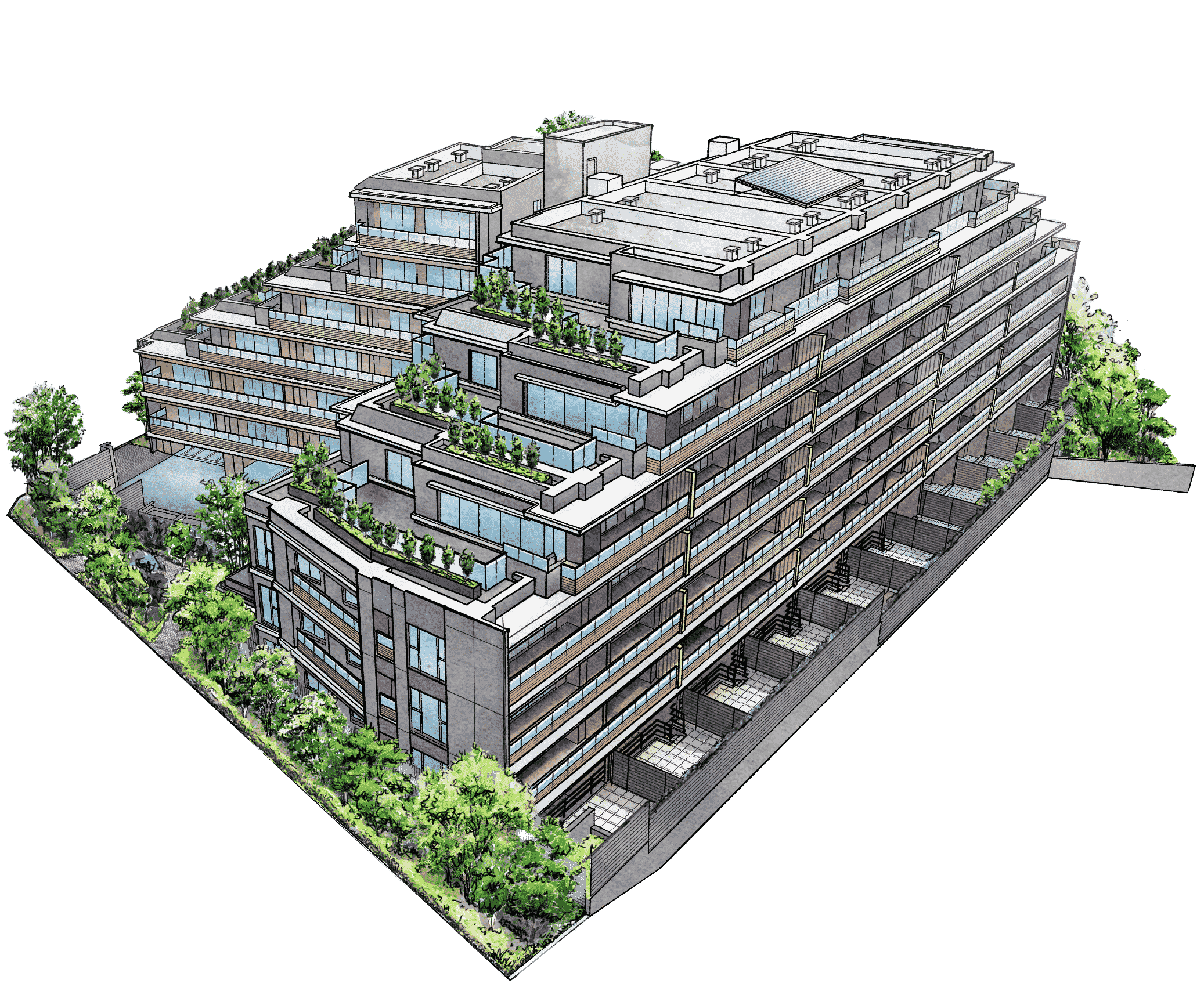 複数の庭園が重なるような外観を構成し、緑にあふれたレジデンスを演出しています。