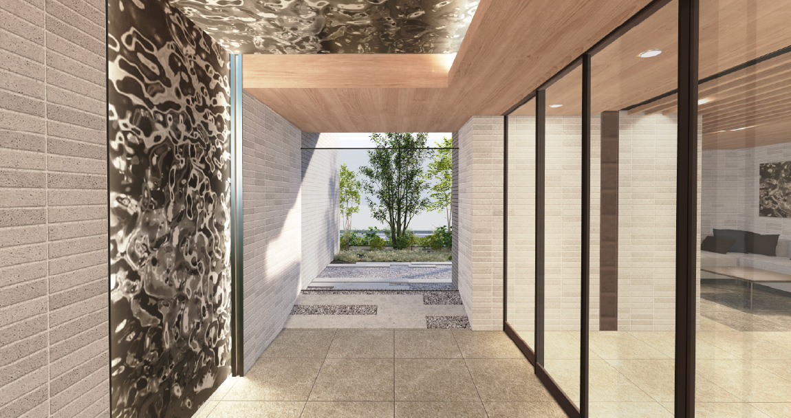 前庭とエントランスコリドーを仕切るガラスは完全に空間を仕切らず、ガラスの上部にクリアランス(隙間)を確保。多摩川の水辺に舞う爽やかな自然の風が、内部の坪庭まで通り抜けるシームレスな空間となっています。