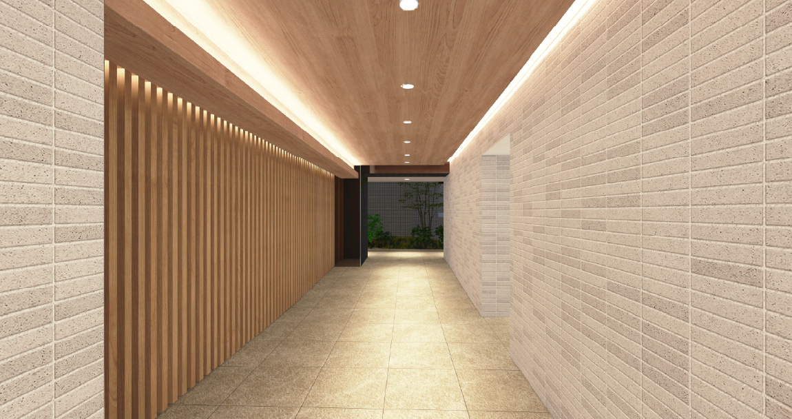 美しい木立が連続する、前庭に開かれたエントランスホールとラウンジ。その先には、前庭の緑を建物内部の坪庭へとリレーするエントランスコリドーを配置。奥行きある動線に沿って、ルーバーをアクセントとした木を連続させることで、外から内へ緩やかに緑がつながるシークエンスを創出しました。