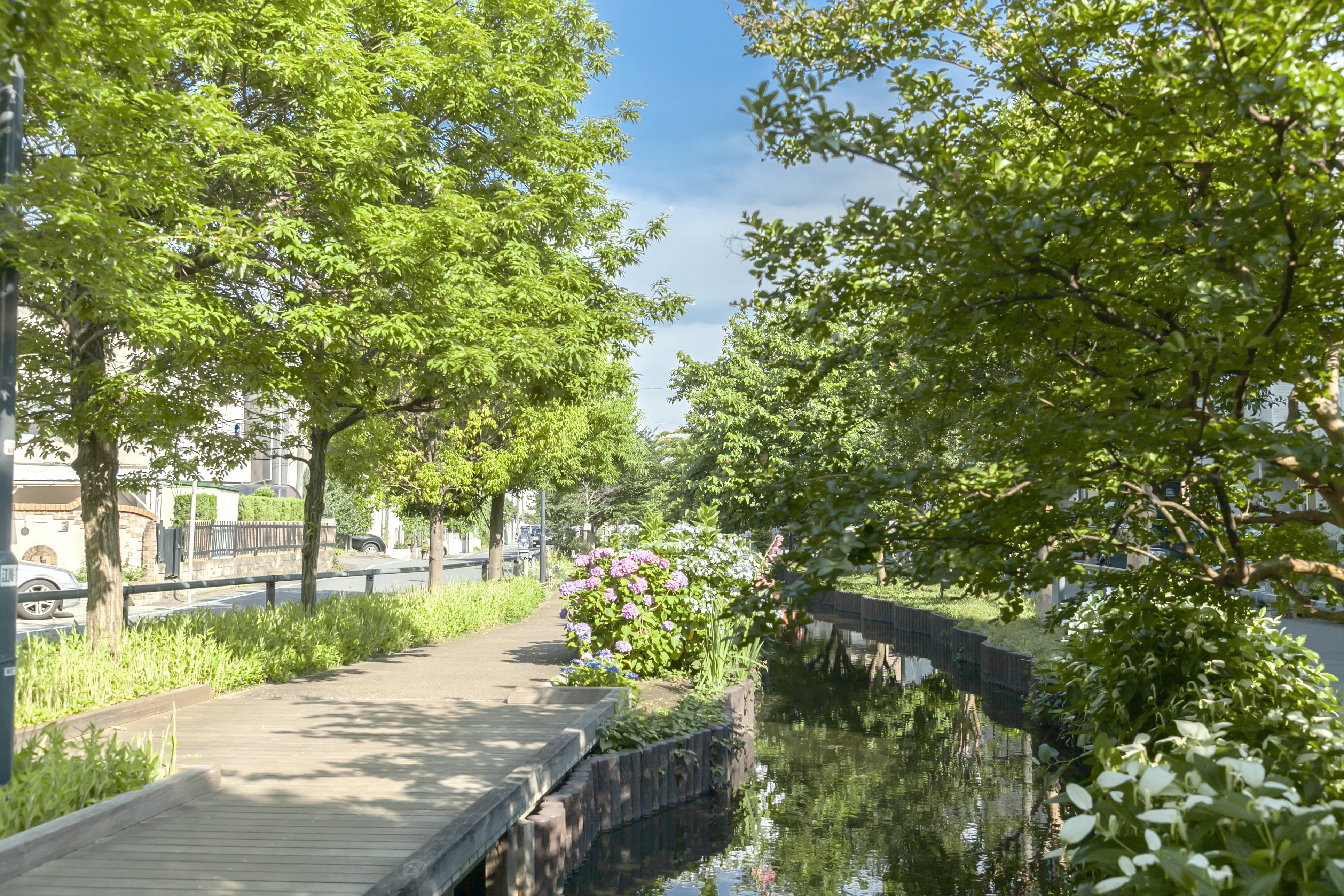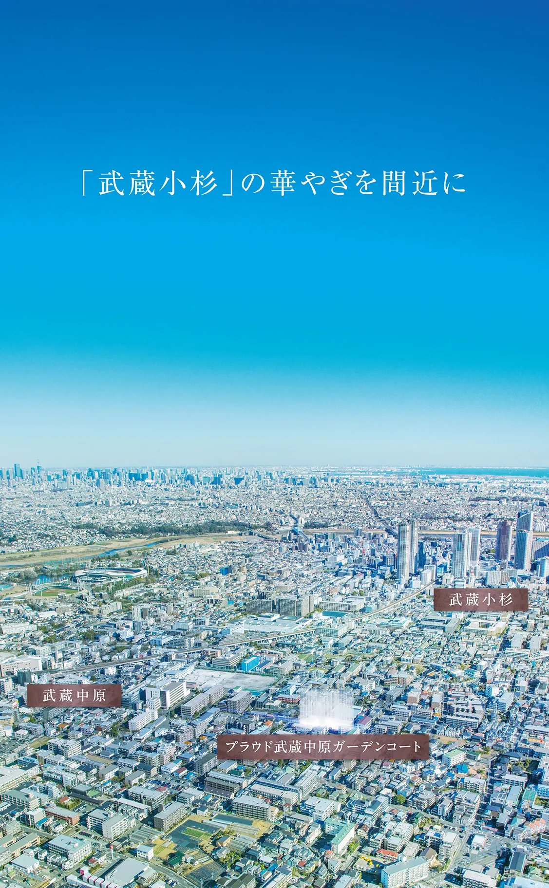 華やかな都市風景が広がる「武蔵小杉」と、活気溢れる商店街が人気の「元住吉」が生活圏。穏やかな住宅街の安らぎと、心地よい自然のオアシスも贅沢に享受する、都市と自然が美しく調和したロケーション。