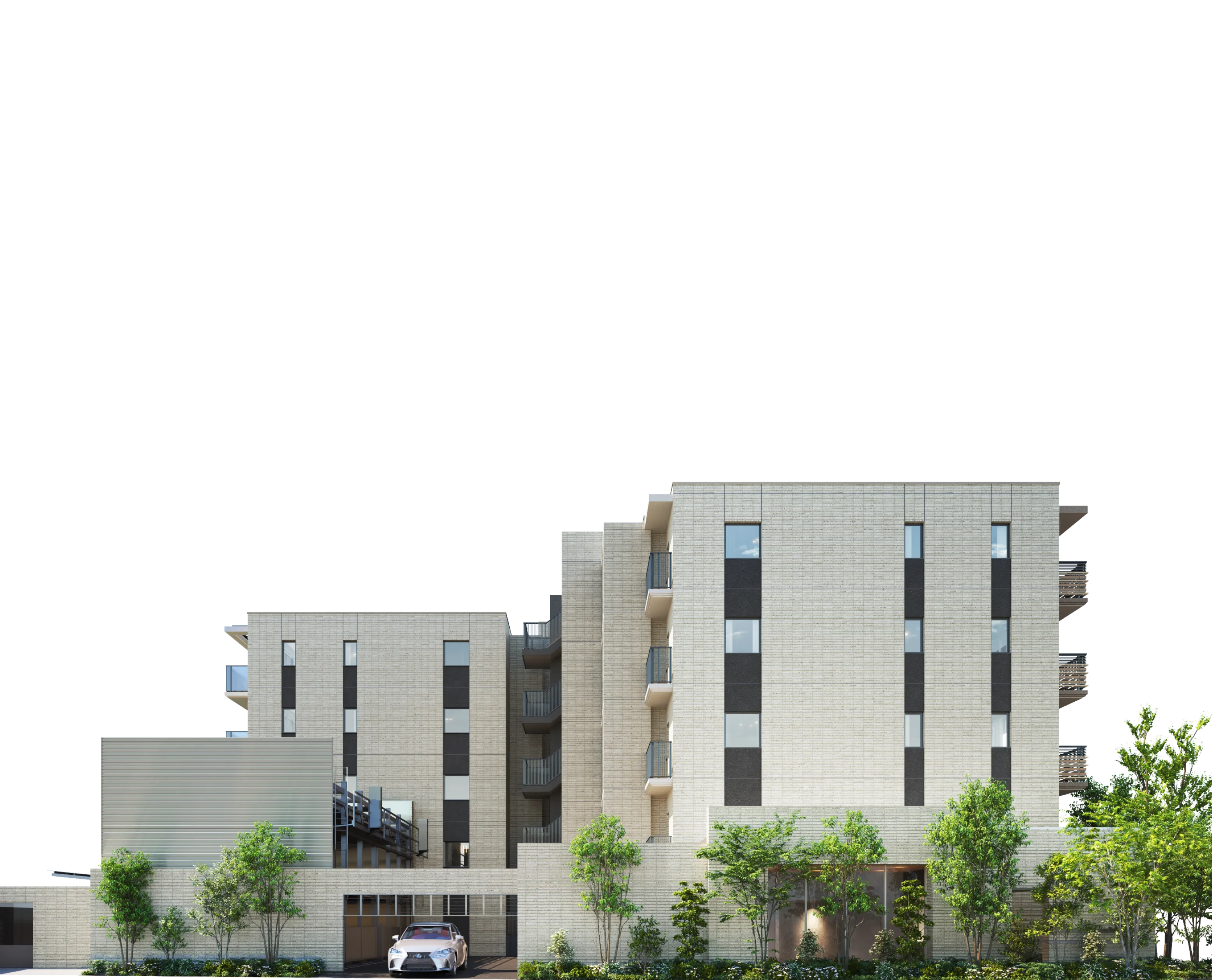敷地面積約2,700㎡のスケールを活かした共用施設、3棟構成の敷地中心にはゆとりある中庭も実現。穏やかな街並みに全72邸・5階建ての重厚なレジデンス。