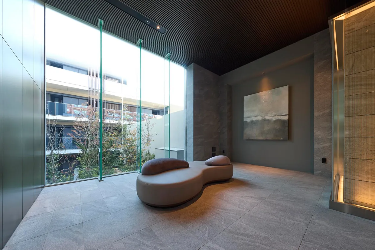 エントランスホールと1階※2のマルチルームから望む中庭にはアラカシやソヨゴ、イロハモミジなど高木や美しい花を咲かせるヤマツツジなど、敷地内にいながら自然を感じられる空間を実現。