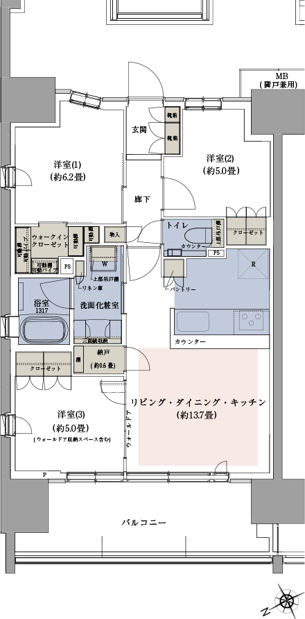 - 洋室(3)にはウォールドアを採用し、リビング・ダイニングとの一体利用に配慮。
