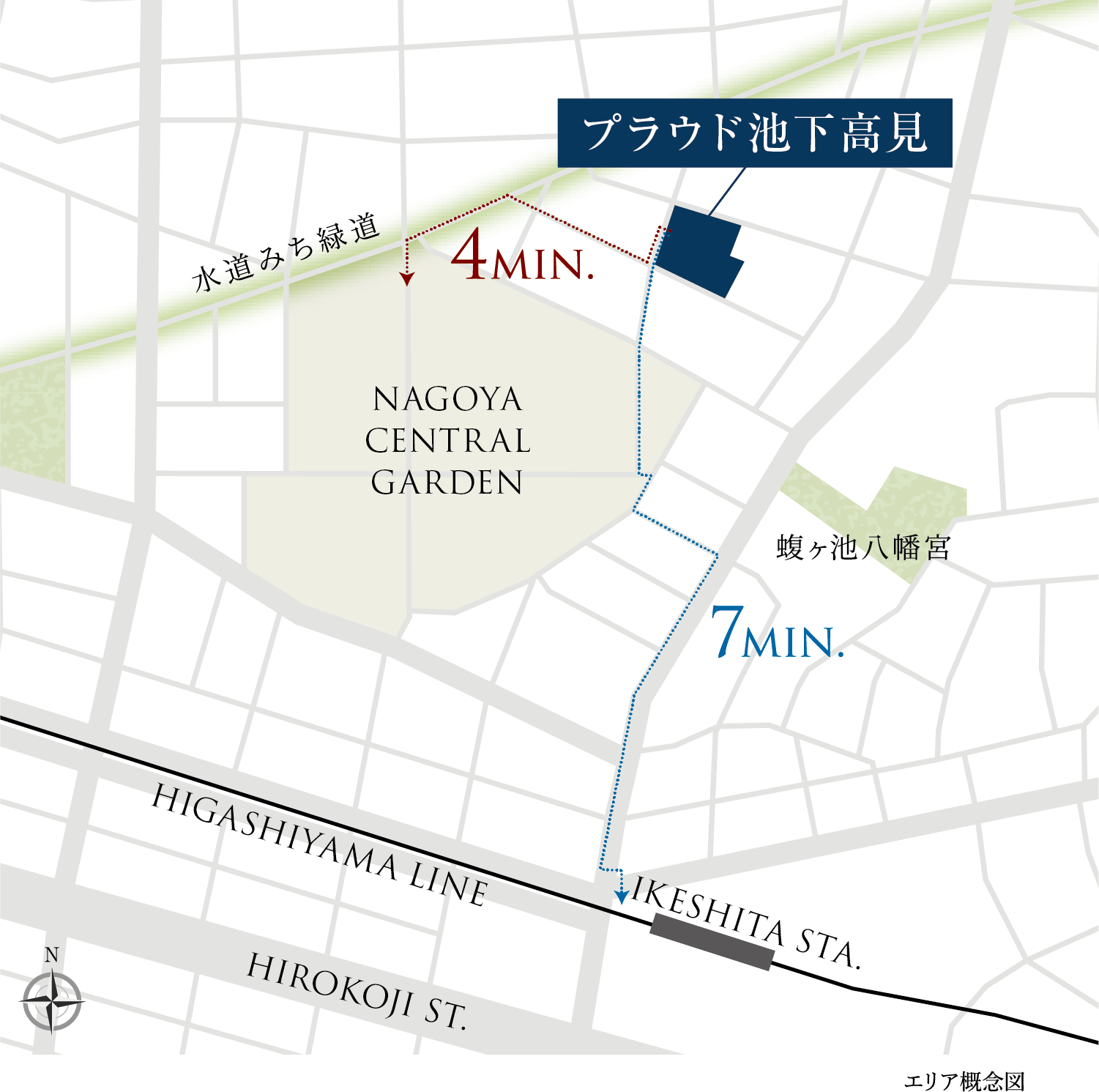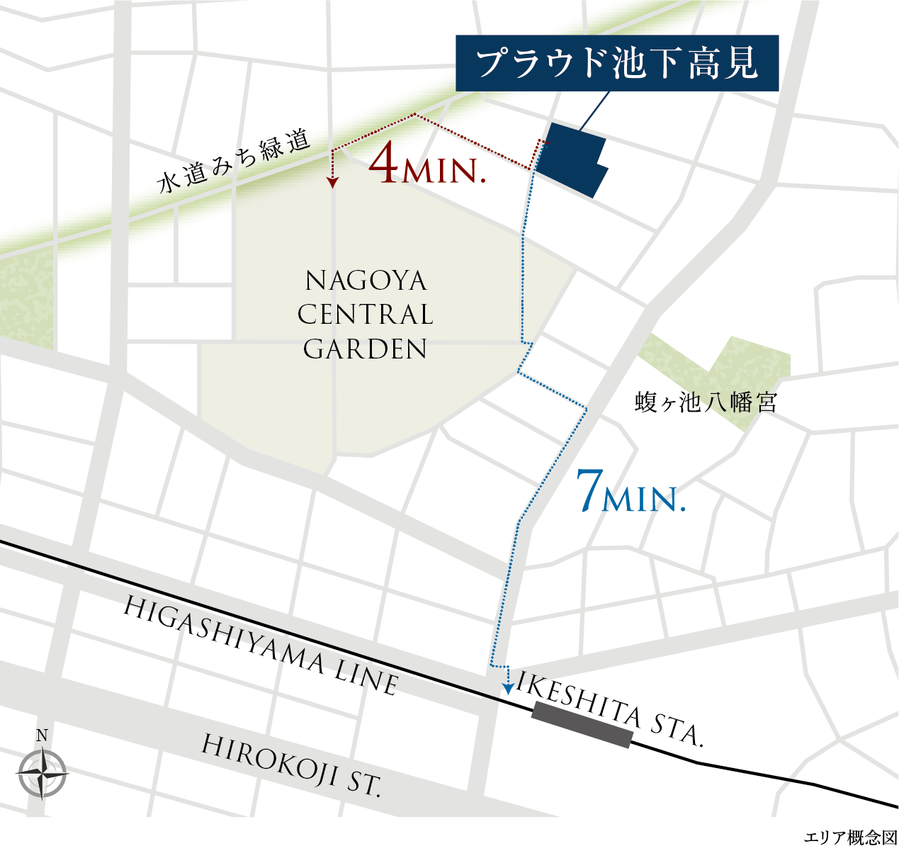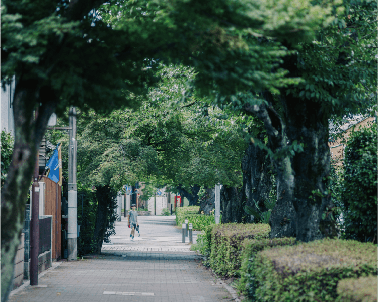 ボンエルフの緑道、水道みち緑道、蝮ヶ池八幡宮、ナゴヤセントラルガーデンによってさらに潤いが広がった街並み。歩道が広く車通りも少ないため、周囲はウォーキングにも最適なエリア。一直線に続いていく水道みち緑道の桜並木は名古屋の中でも穴場の名所として知られ、千種区のなかでもとりわけ静かで美しい、洗練された景色がこの街には満ちている。