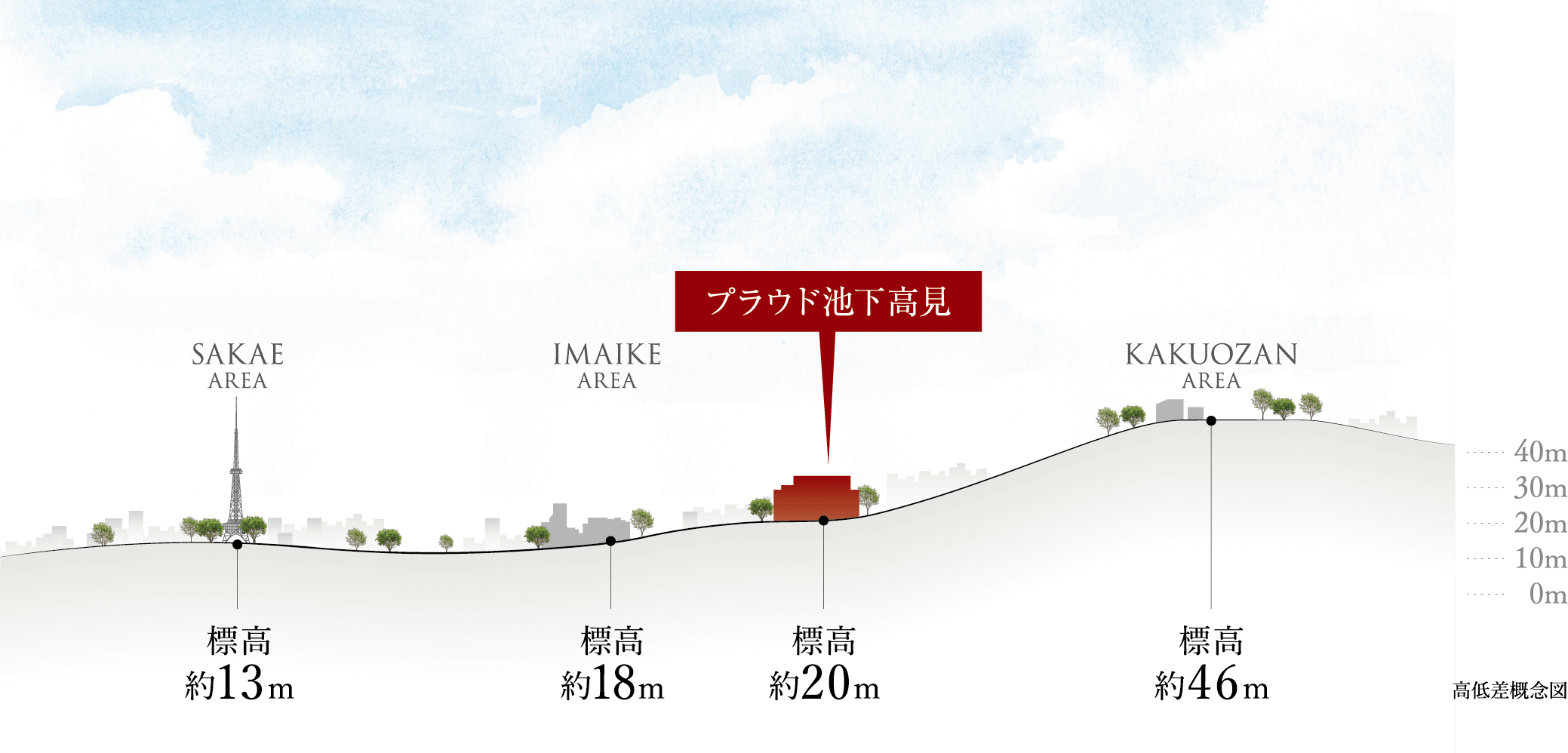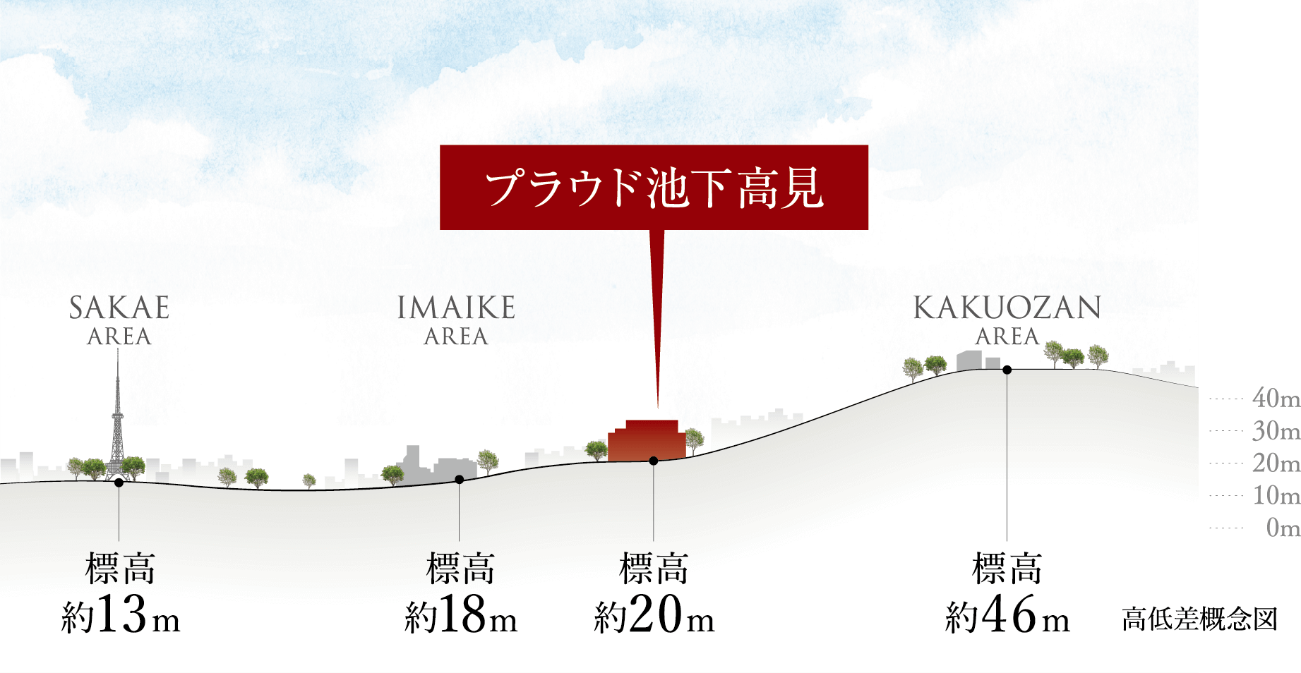 東部丘陵地へ続く標高約20mの高台に位置し、強固で安定した地盤の上に誕生する「プラウド池下高見」。浸水の危険度も極めて低い※1安心感も、ここに暮らす大きな価値となります。※1/名古屋市ホームページ「洪水ハザードマップ」