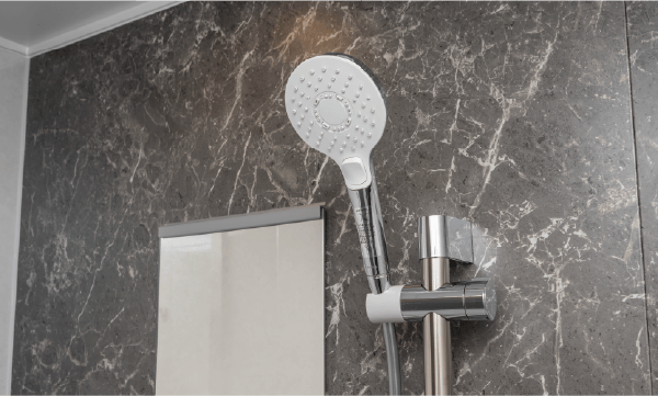 クリックシャワー手元の止水機能と大粒の水玉が左右にスイングしながら勢いよく吐水する新開発のウェーブ水流を搭載。スプレーシャワーとのミックスによる適度な刺激感のある浴び心地と節水を実現。