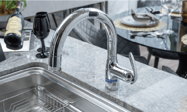 タッチレス水栓デザイン性の高いシームレスなボディ。浄水器を内蔵し原水・浄水を使い分けられます。手が汚れていても手をかざすだけで、吐水と止水ができるため、操作性が良く便利です。