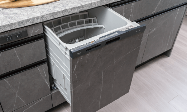 深型食洗器を採用。大容量なのでたくさんのお料理を作ってもまとめて洗えて、後片づけがラクラク。手洗いに比べ節水でき、高温洗浄で油汚れもスッキリ。