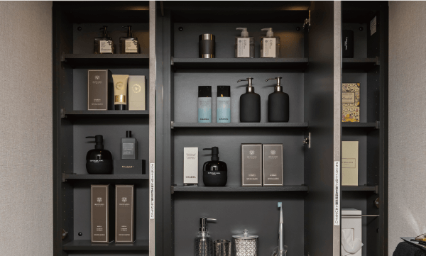 洗面化粧台には三面鏡収納を採用。化粧品など、必要なものがすっきりと収まり、毎日の生活にとても便利です。