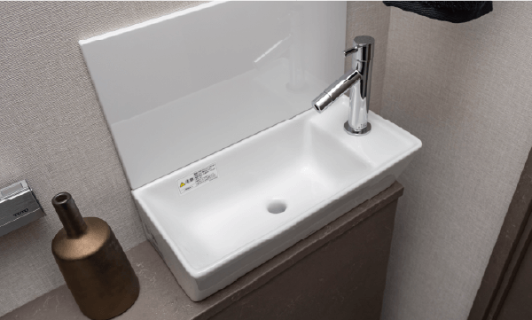 キャビネットに手洗い器がついたコンパクトな手洗い。防汚加工された手洗いボウルを採用しているため、お手入れも簡単です。