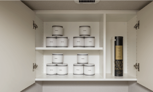 洗剤やトイレットペーパーなどの収納に便利な扉付き吊戸棚。下部には飾り棚として利用できるスペースを設置。