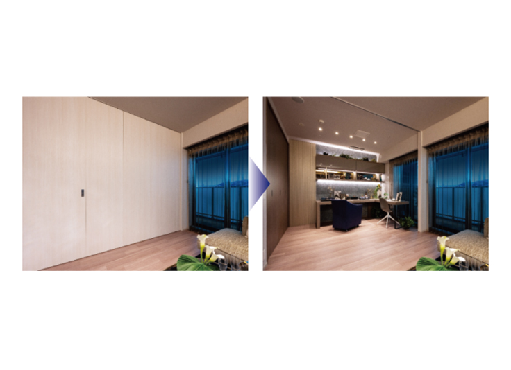 開ければリビングと洋室が一体化、閉めれば壁のように空間を仕切ることができ、暮らし方やシーンに合わせてフレキシブルなレイアウトが可能です。