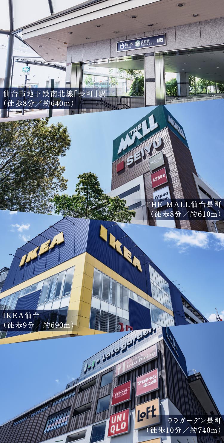 ※仙台市地下鉄南北線「長町」駅(徒歩8分/約640m)・「長町南」駅(徒歩8分/約630m)、JR東北本線・JR常磐線・仙台空港アクセス線「長町」駅(徒歩8分/約620m)、THEMALL仙台長町(徒歩8分/約610m)、IKEA仙台(徒歩9分/約690m)、ララガーデン長町(徒歩10分/約740m)