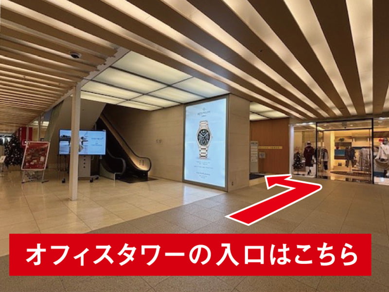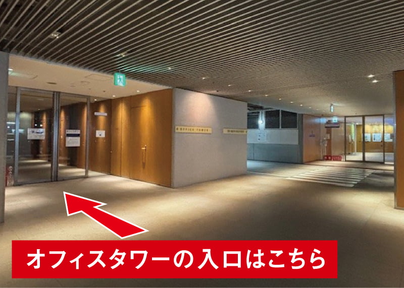 ご来場の際は、建物内右奥にございます「オフィスタワー入口」よりご入館のうえ、専用エレベーターにて17階までお越しください。 ※なお、商業フロア用のエレベーターは6階までのご利用となっておりますので、ご注意ください。