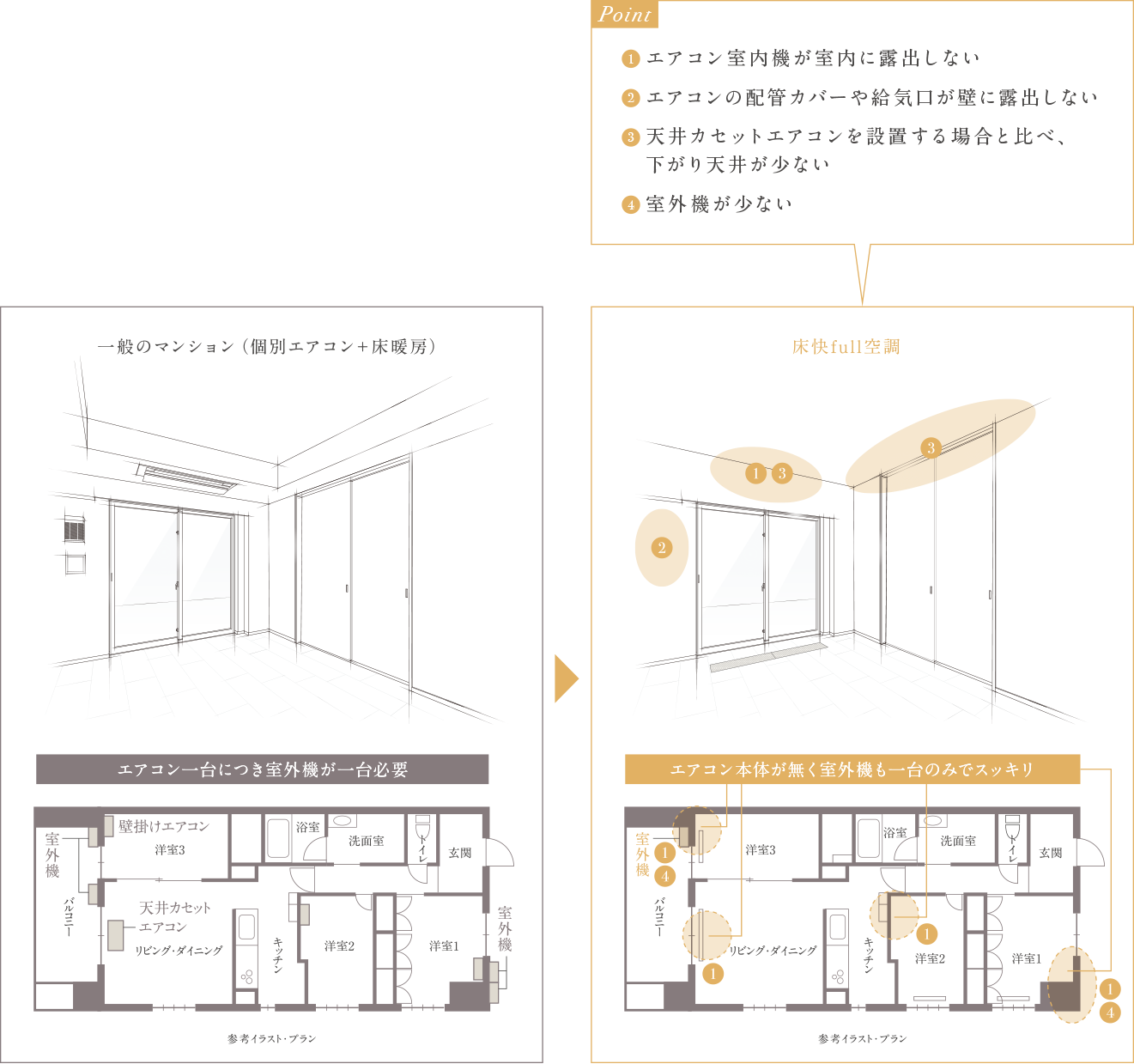従来のエアコンであれば、各居室に1台ずつのエアコン、バルコニーには台数分の室外機が必要でしたが、「床快full空調」はルームエアコンをビルトイン、室外機も1台で家中をまかなえます。また、第一種換気の採用により壁の給気口もないため、空間がスッキリします。