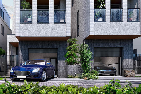 ※掲載の外観完成予想図は計画段階の図面を基に描き起こしたもので実際とは異なります。また、今後変更になる場合があります。なお、外観の細部・設備機器・配管類及び電柱・架線・道路標識・周辺建物等は一部省略または簡略化しております。植栽につきましては特定の季節の状況を表現したものではなく、竣工時には完成予想図程度には成長しておりません。ボリューム・形状は実際と異なる場合があり、樹種等は変更となる場合があります。家具・調度品等は販売価格に含まれておりません。タイルや各種部材につきましては、実物と質感・色等の見え方が異なる場合があります。